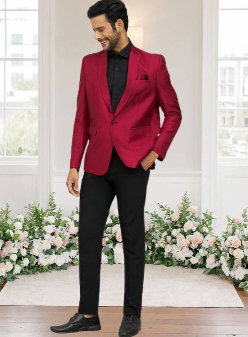 | Product Description | The Ensemble Features A Sophisticated Maroon Blazer With A Sleek Black Satin Shawl Lapel And Matching Black Pocket Detailing, Offering A Sharp Contrast Against The Rich Tone. It Is Paired With Classic Black Formal Trousers, Creating A Refined, Modern Look Perfect For Formal Events Or Evening Occasions. |