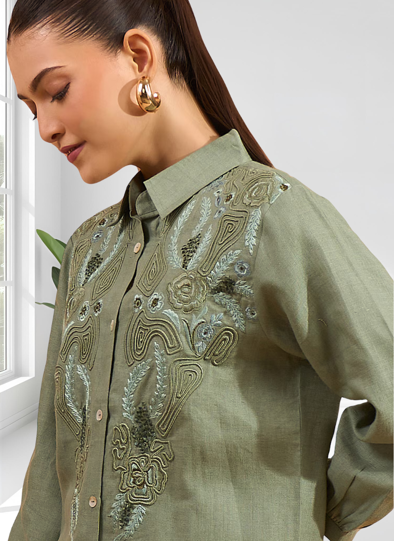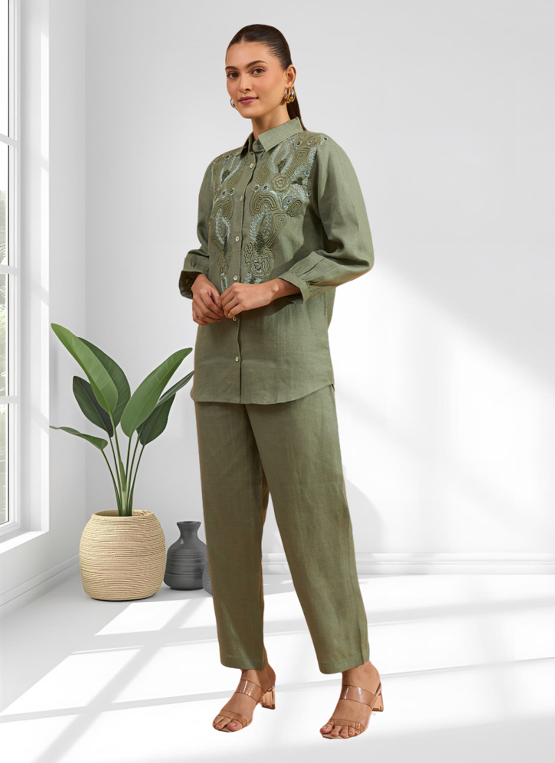 Pista green linen kurta with pant for women's