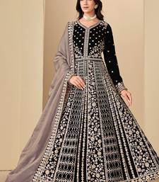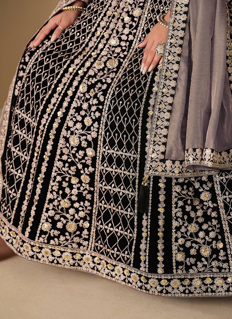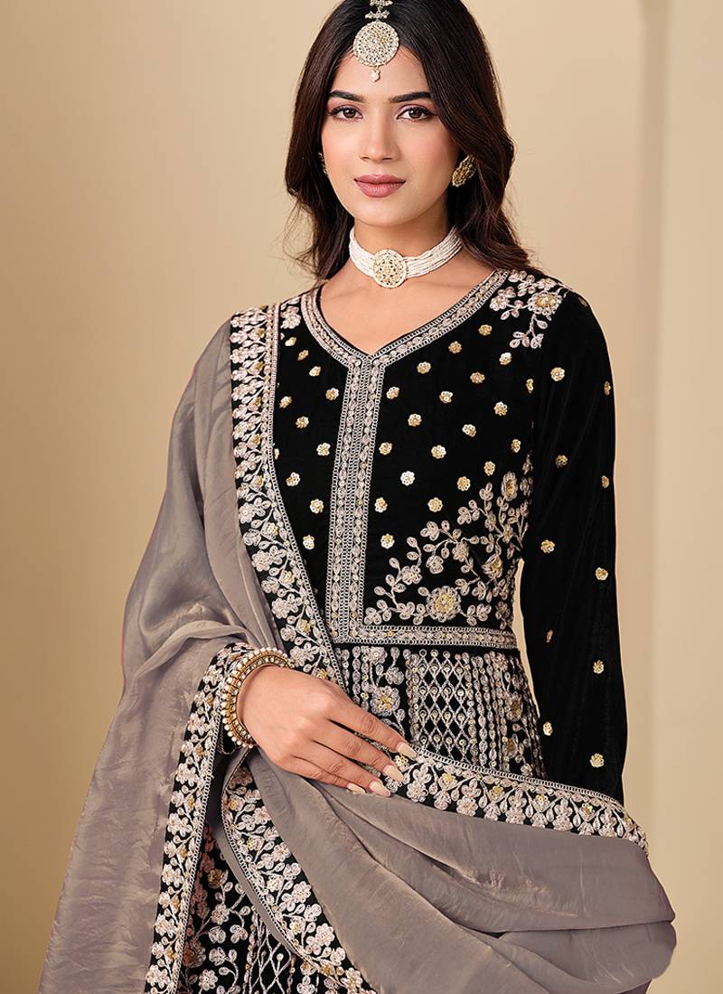Black embroidered sequence velvet anarkali suit semi stitched