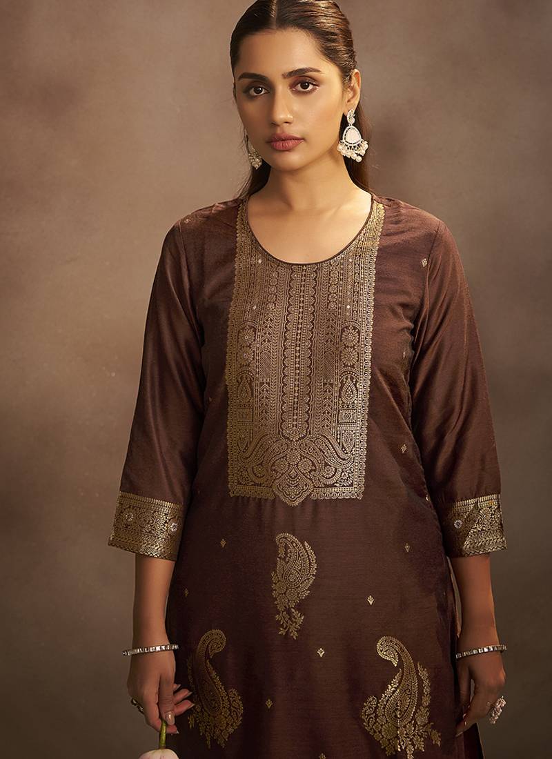 Brown jacquard art silk straight kurta set with dupatta stitched