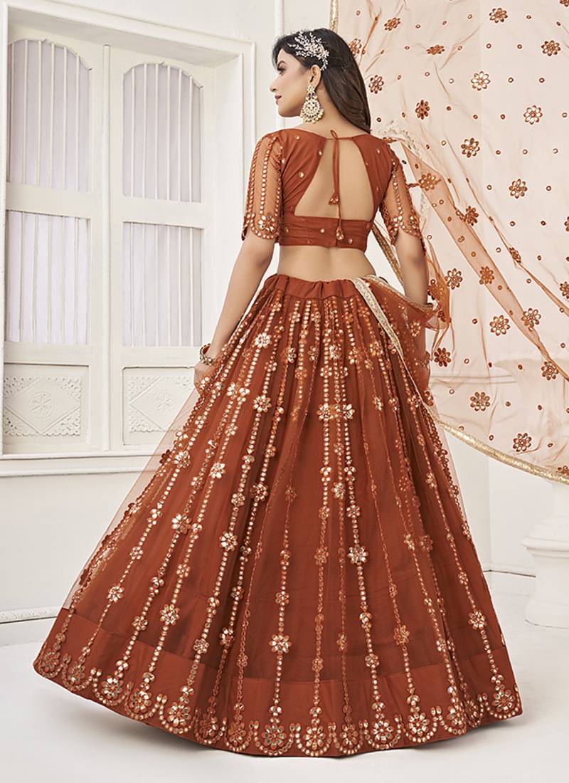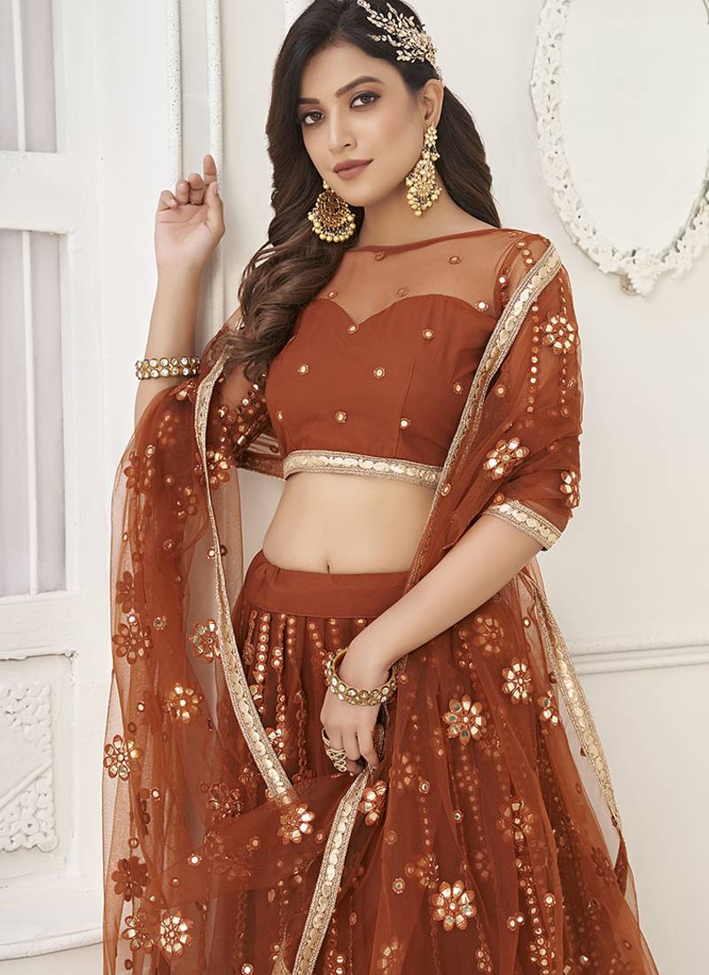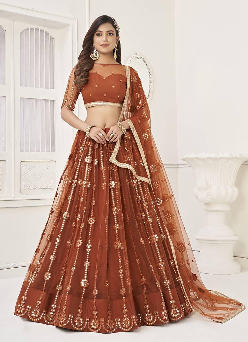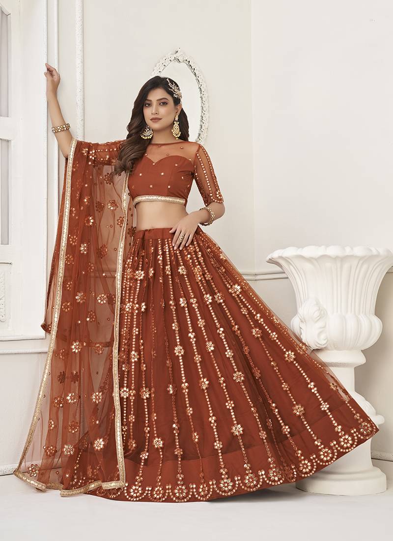 | Product Name | Brown Thread & Sequins Embroidery Work Net Lehenga | |