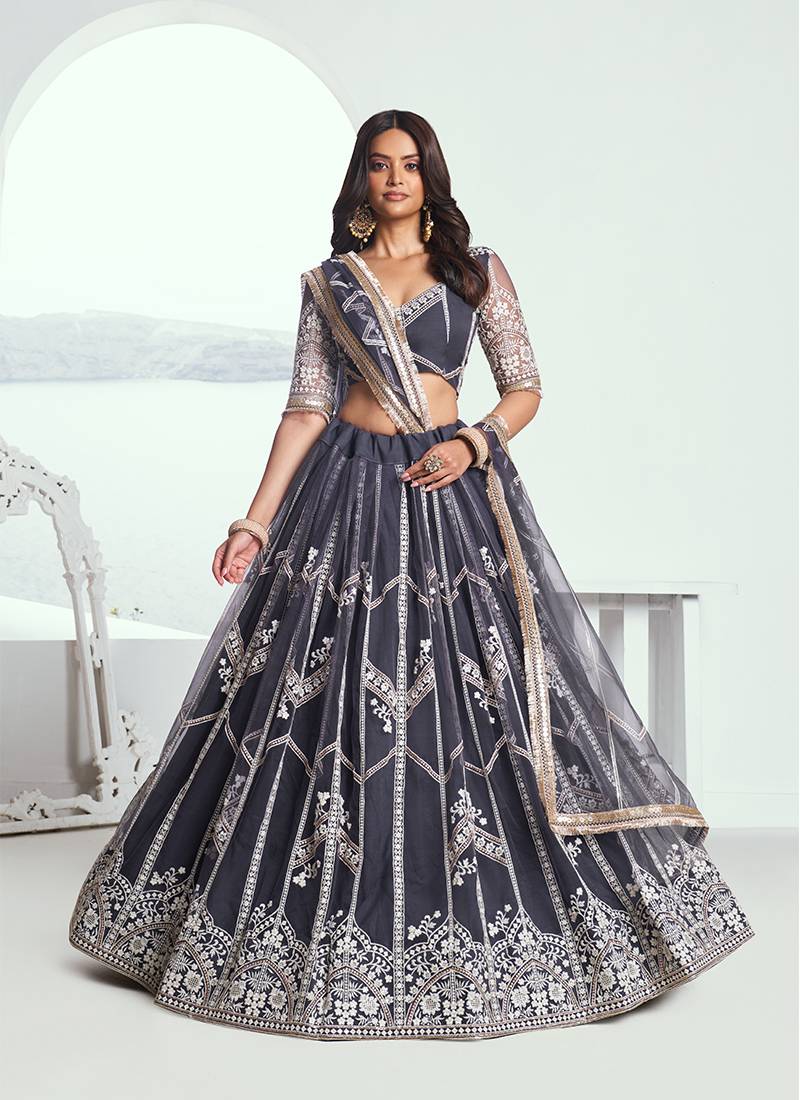 | Product Name | Dark Grey Thread & Sequins Embroidery Work Net Lehenga | |