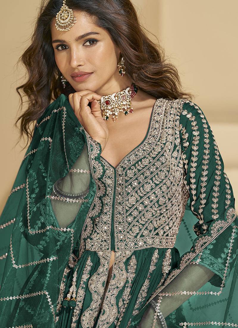 Dark teal embroidery codding sequence work with chinon silk anarkali & dupatta for women semi stitched