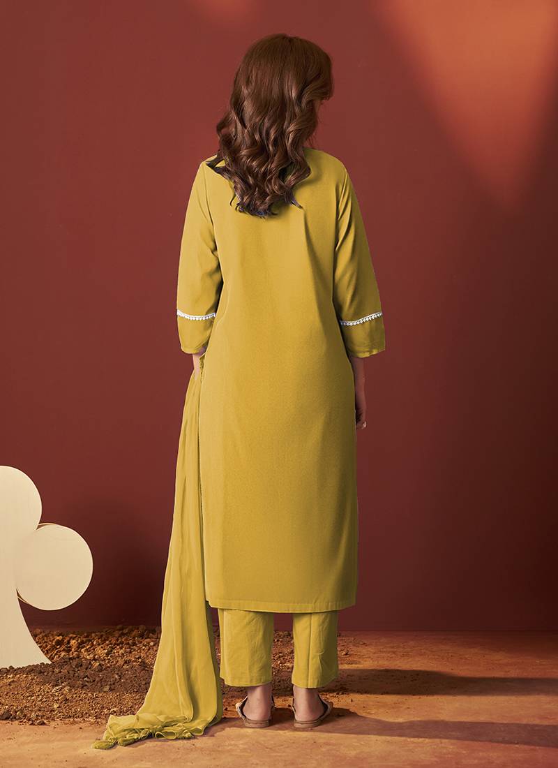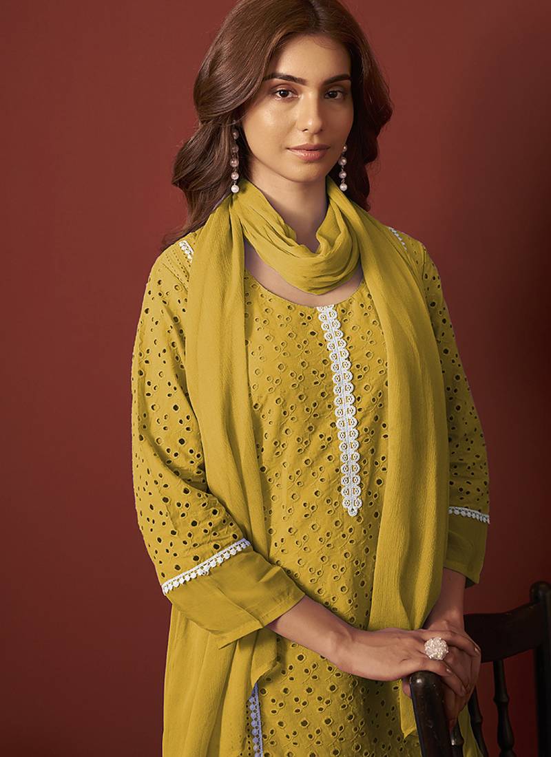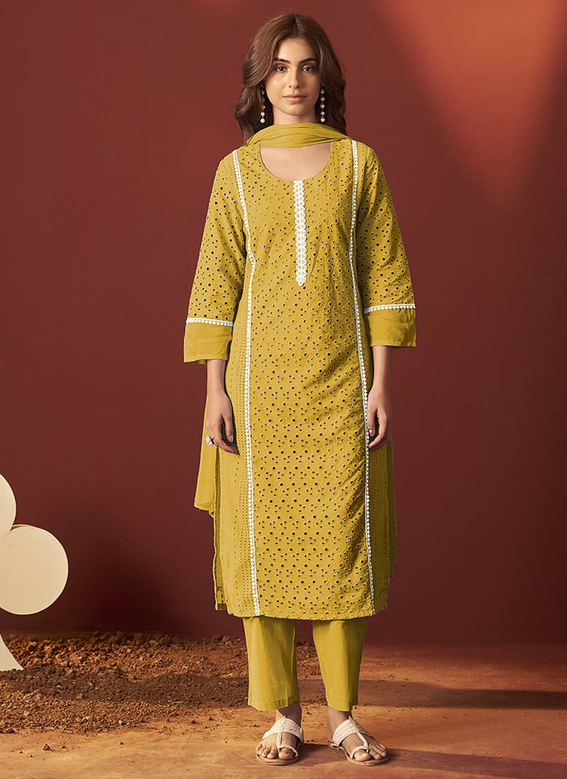 | Product Name | Mustard Schiffly With Lace Work Pure Cotton Straight Kurta Set With Dupatta For Women | |