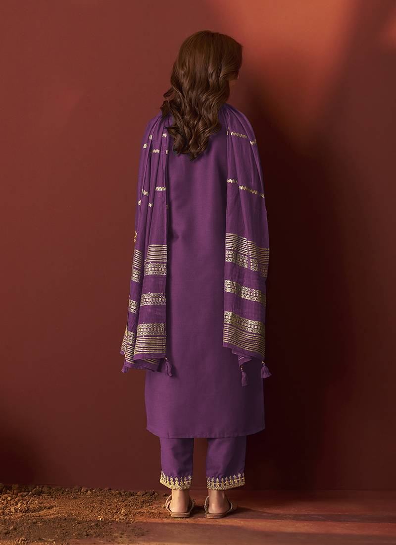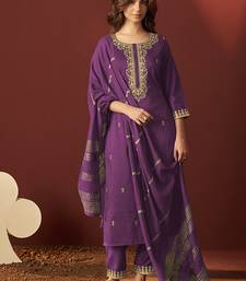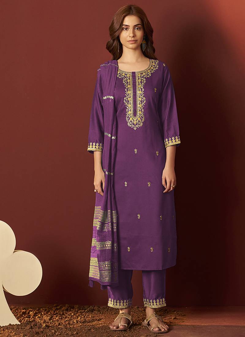 Purple embroidered chinnon straight kurta set with dupatta stitched