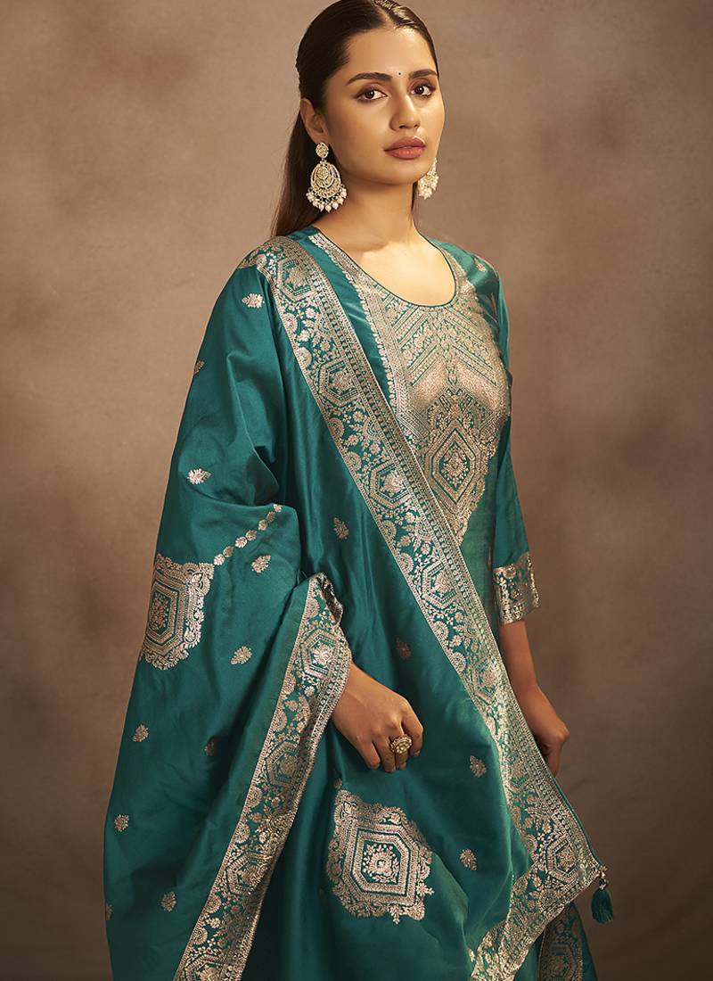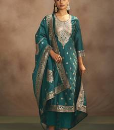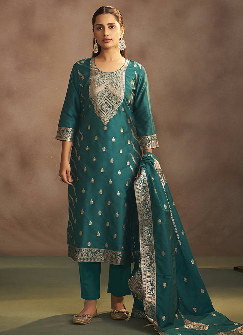 Rama green jacquard art silk straight kurta set with dupatta stitched