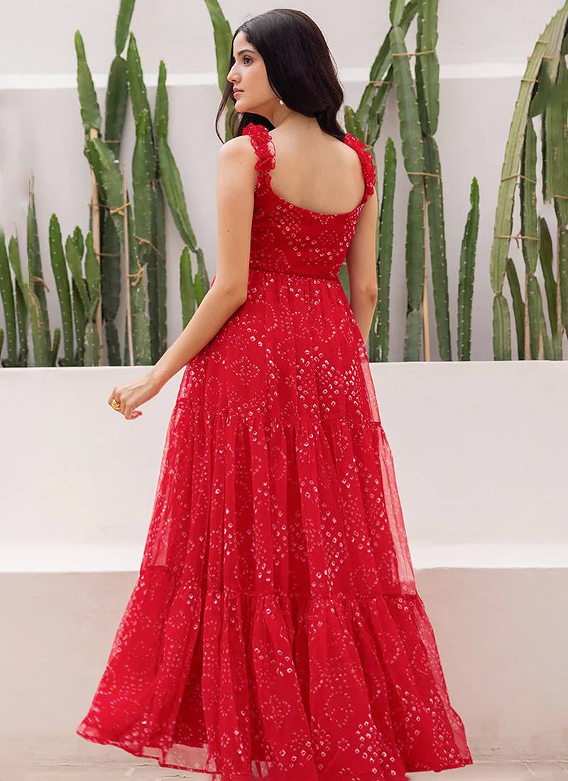 Red heavy digital printed faux georgette anarkali fully flared gwon style stitched
