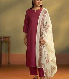 Red solid & printed cotton blend straight kurta set with printed dupatta stitched