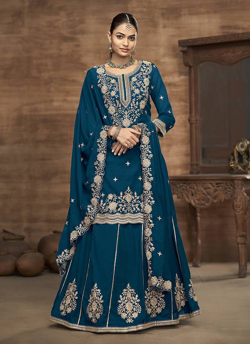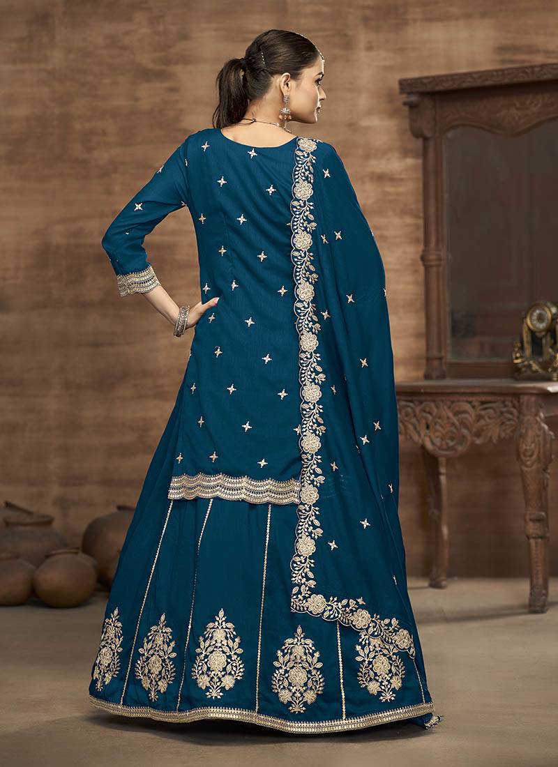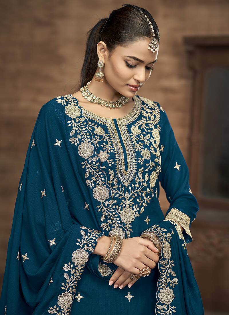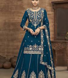 Teal blue embroidered silk free size full stitched suit