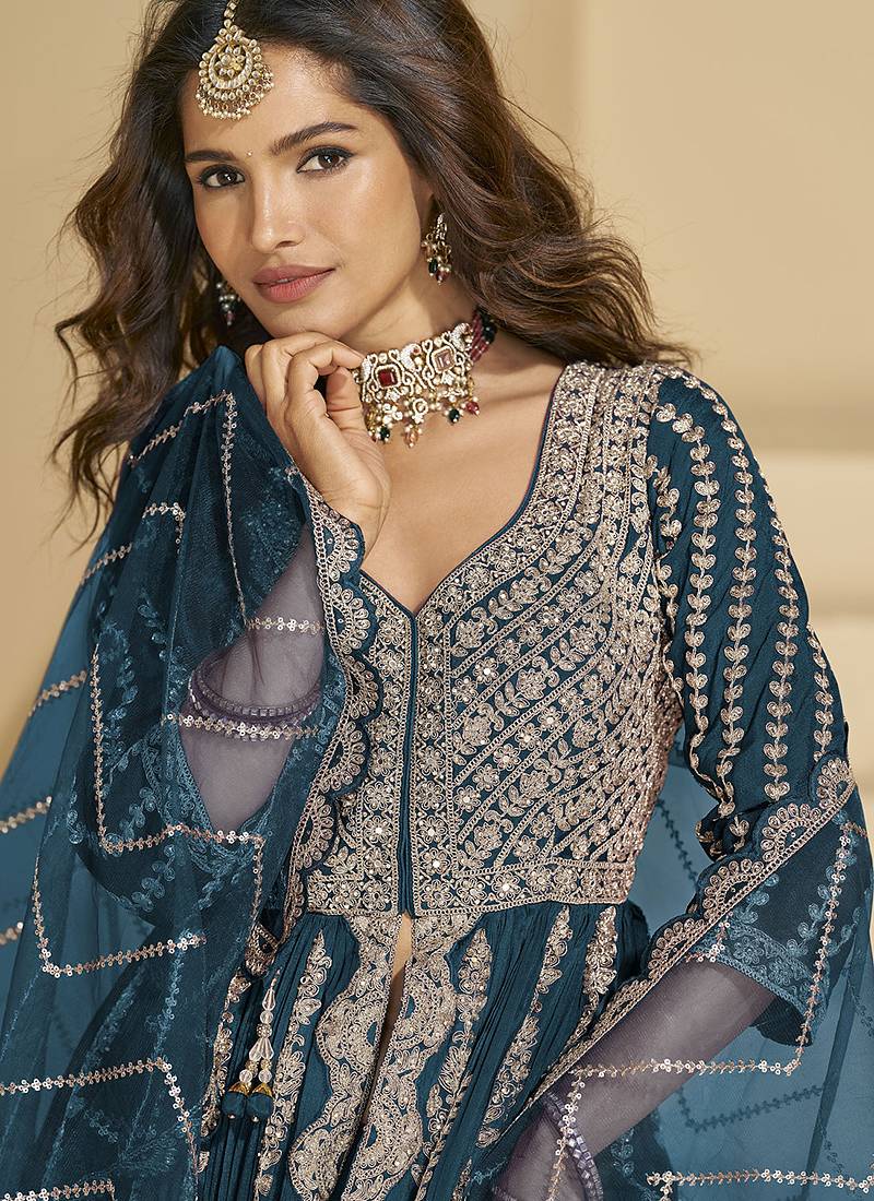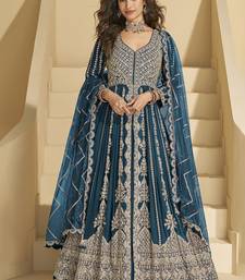 Teal blue embroidery codding sequence work with chinon silk anarkali suit semi stitched