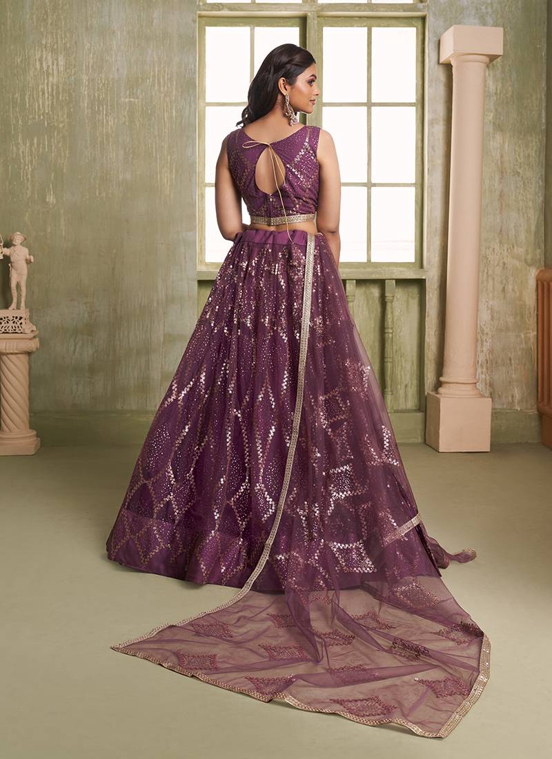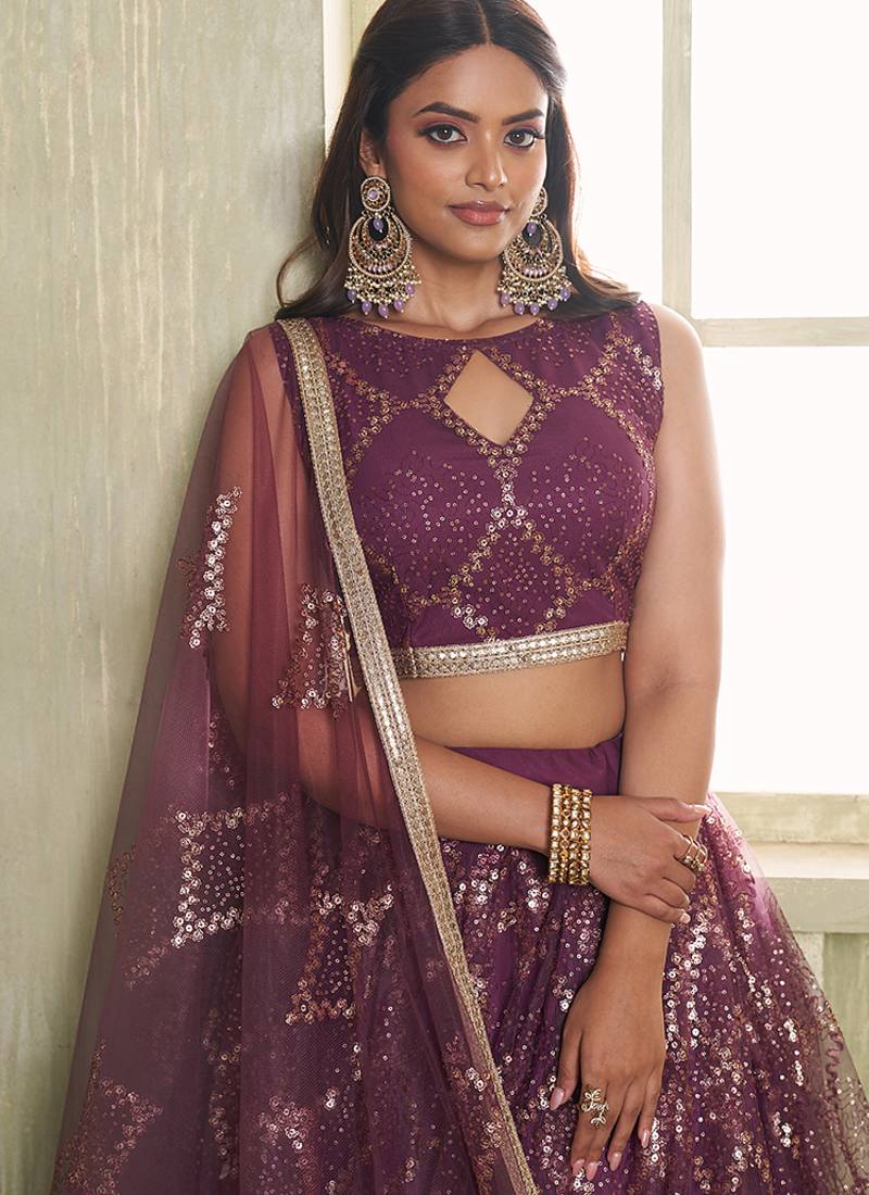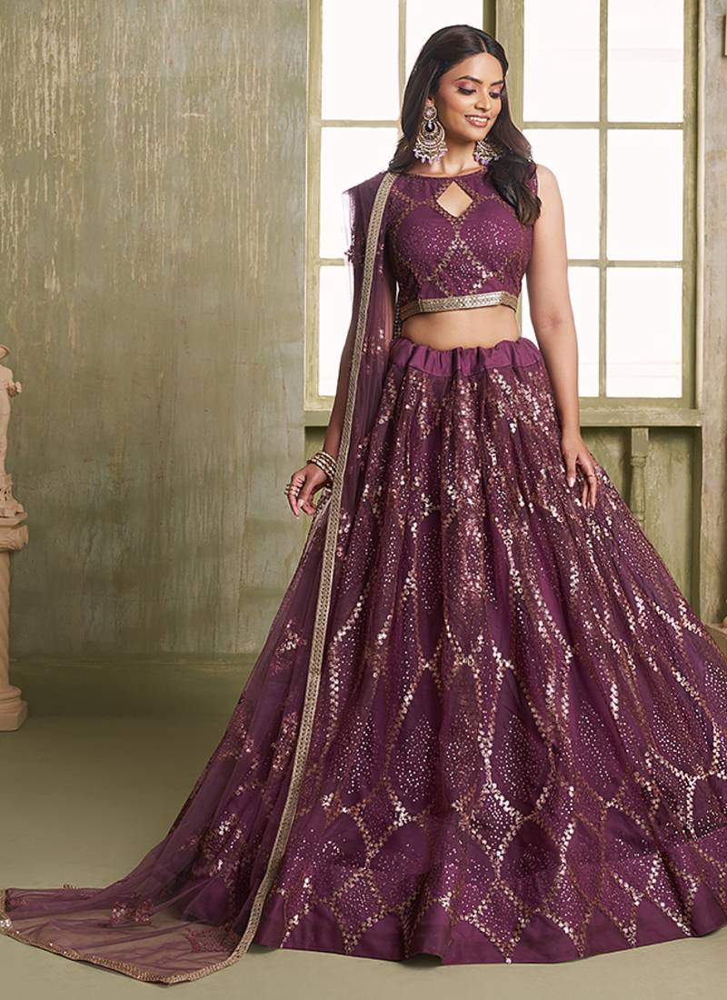 Wine thread & sequins embroidery work net lehenga