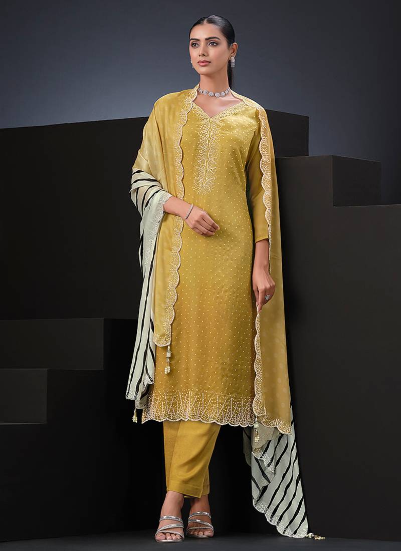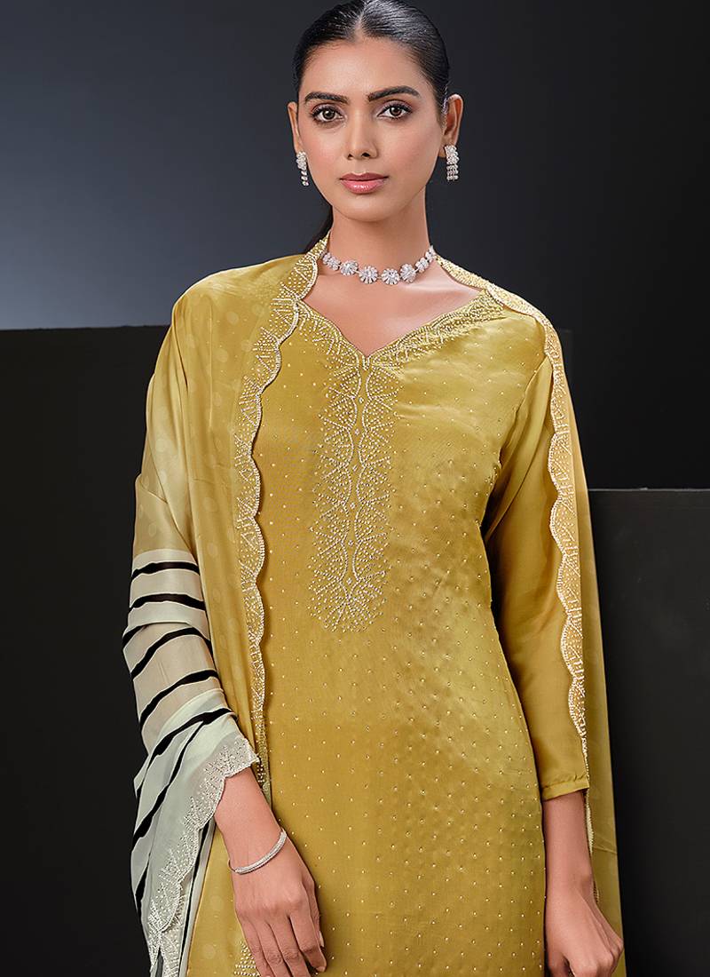Yellow swarovski satin silk straight cut salwar kameez semi stitched