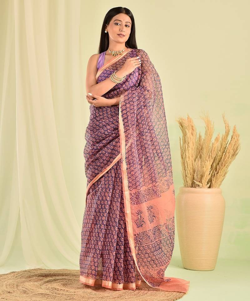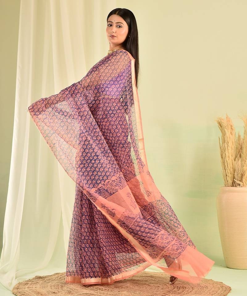 Blue hand block printed kota doria saree