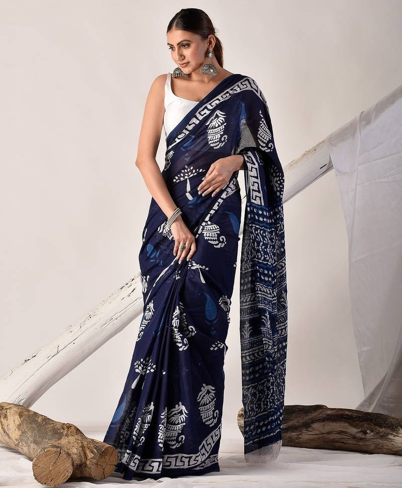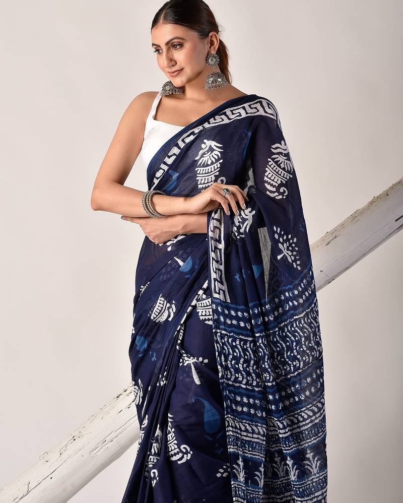 | Product Name | Blue Hand Block Printed Pure Cotton Saree | |