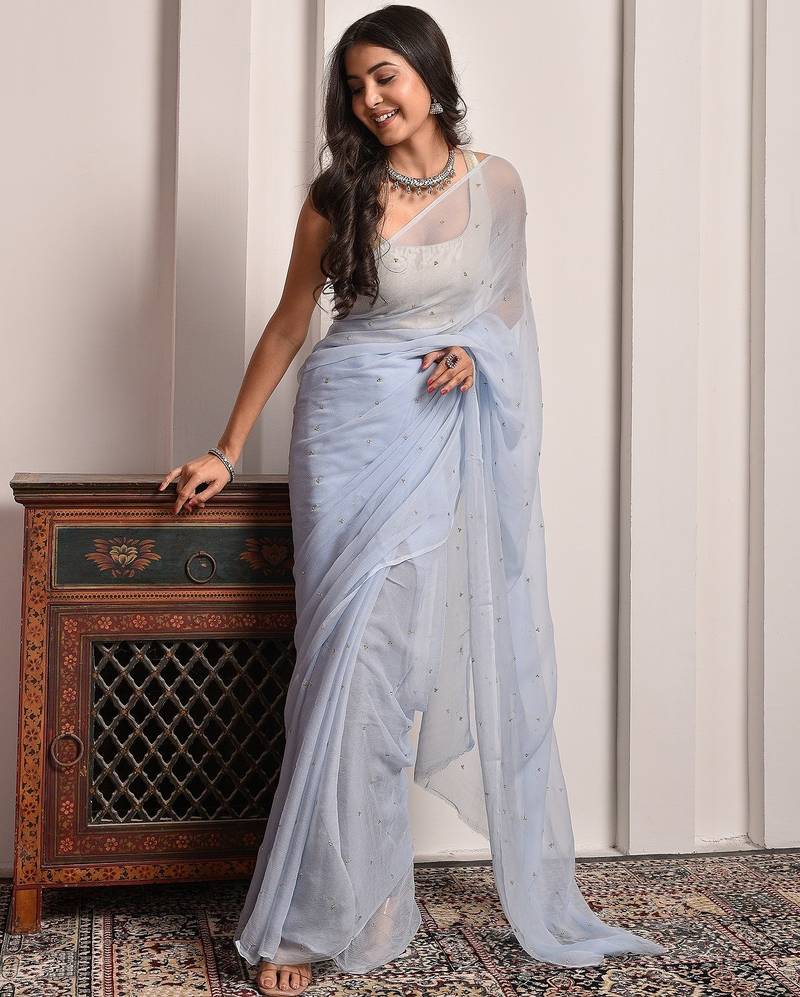 | Product Description | Embrace Understated Elegance With This Grey Hand Embellished Solid Chiffon Saree, Designed For A Refined And Timeless Look. Crafted From Lightweight Chiffon, The Saree Is Beautifully Hand Embellished With Intricate Sequin Work Motifs Spread All Over, Adding A Subtle Shimmer And Delicate Texture To The Ensemble. The Soft Grey Tone Enhances Its Sophisticated Appeal, Making It A Versatile Choice For Both Festive And Evening Occasions. It Comes With A Matching Grey Crepe Blouse Piece. |