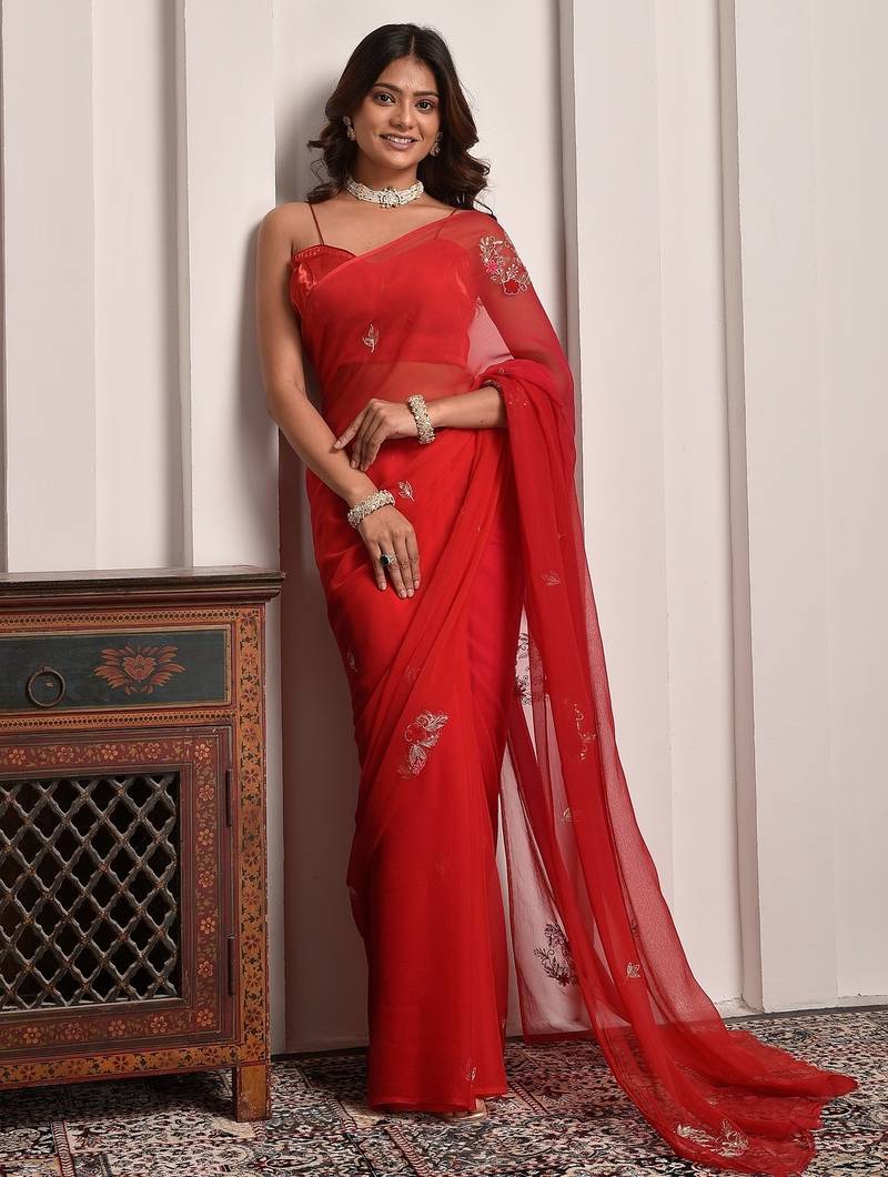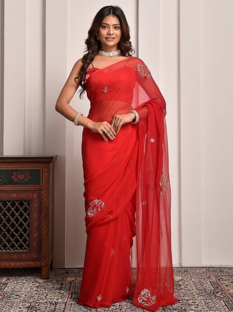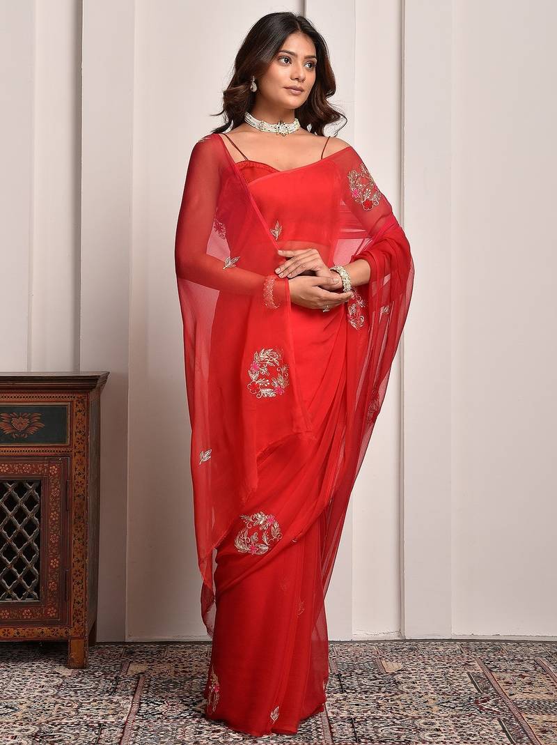 | Product Name | Red Shaded Hand Embellished Chiffon Saree | |