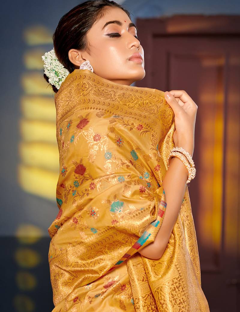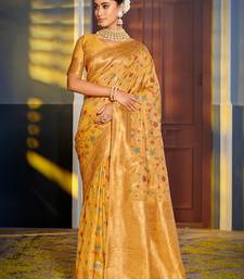 Graceful yellow banarasi silk blend saree with golden zari woven border & floral jaal – wedding & festive wear