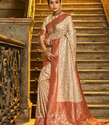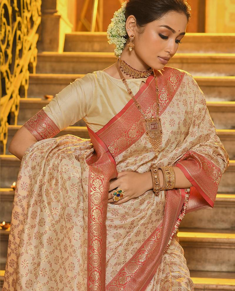 Ivory and red banarasi silk blend saree with golden zari – regal elegance for timeless celebrations
