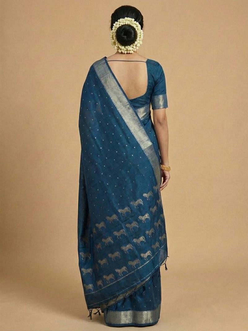 | Product Description | Dive Into The Serenity Of This Peacock Teal Blue Saree. A Unique Blend Of Blue And Green Tones, This Soft Silk Drape Features Delicate Golden Dots And A Rich Hemline Showcasing Running Horse Motifs. It Is An Ideal Choice For Corporate Events, Family Gatherings, Or Day Weddings. |
