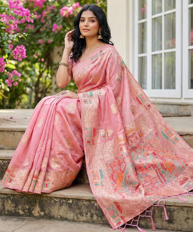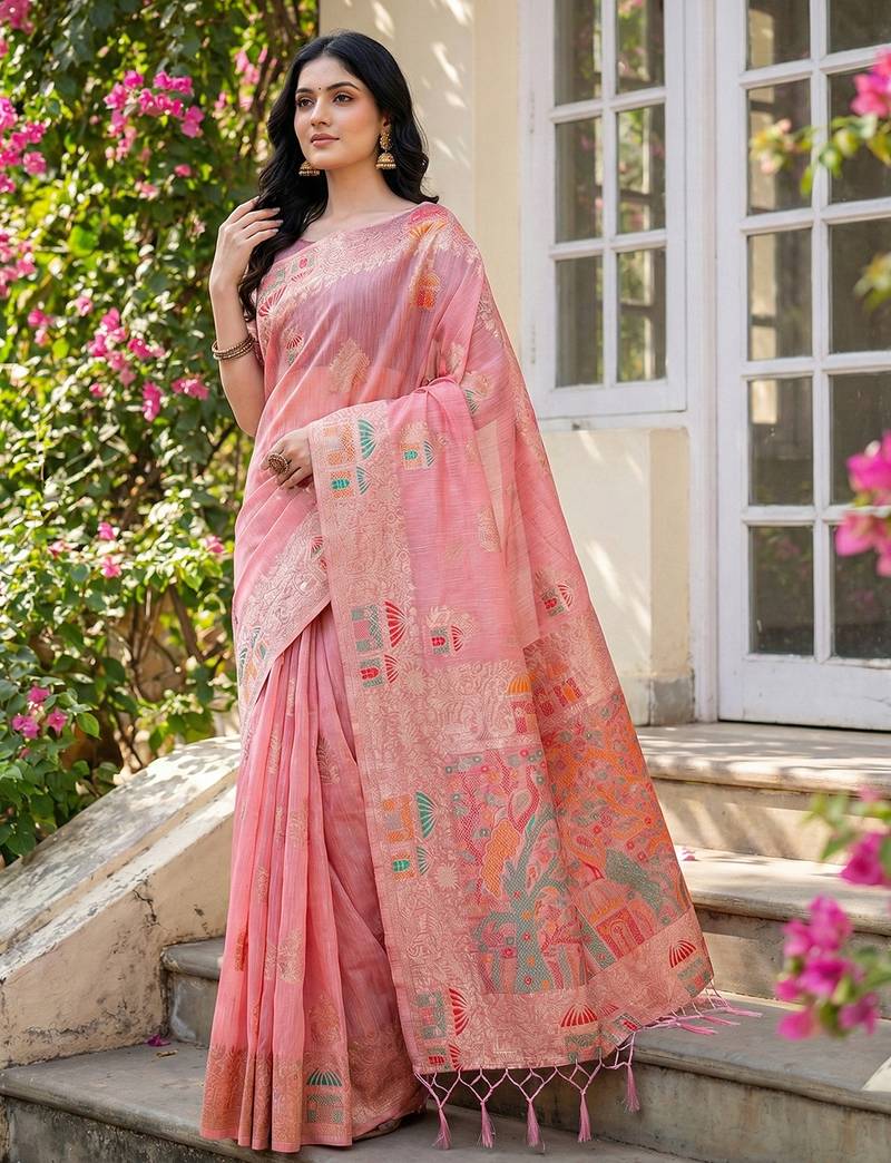 | Product Name | Sutriti Blush Pink Woven Linen Saree With Artistic Pallu & Tassels | Elegant Party & Festive Wear | |