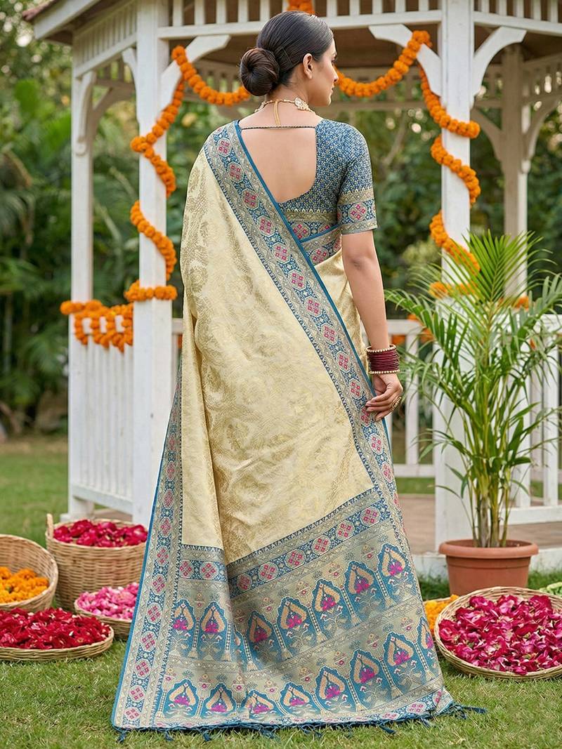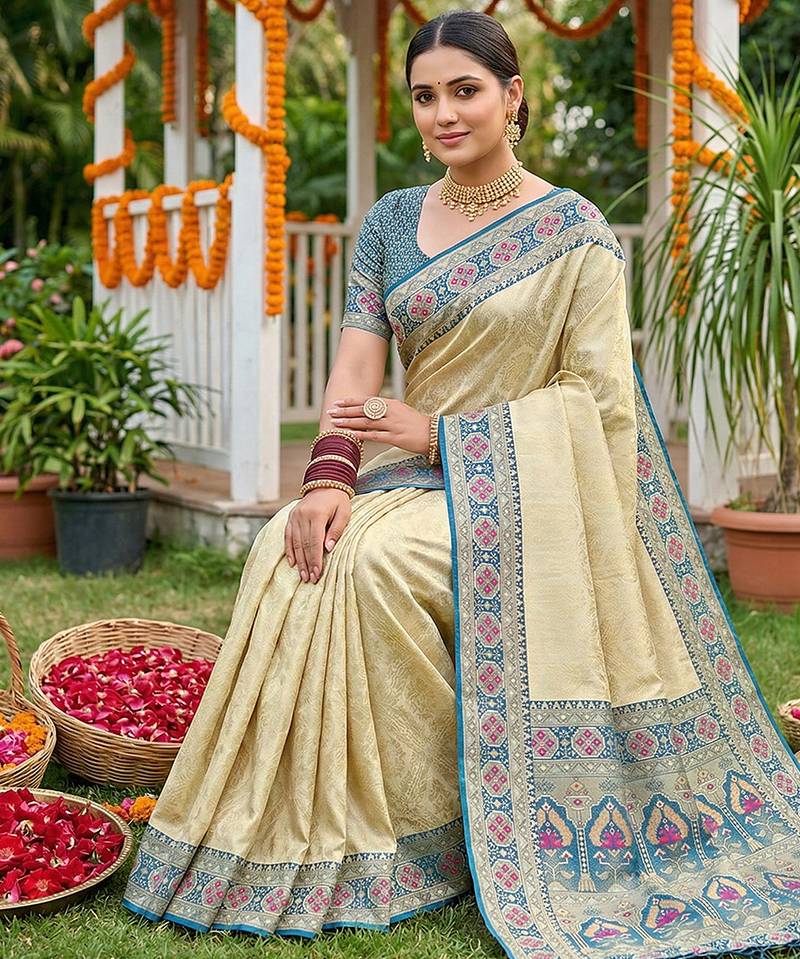 Sutriti elegant cream & teal art silk kanjivaram style saree with rich zari border & paisley pallu
