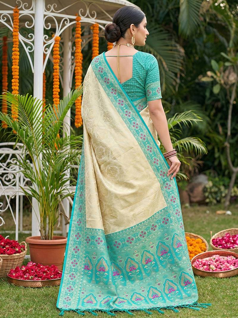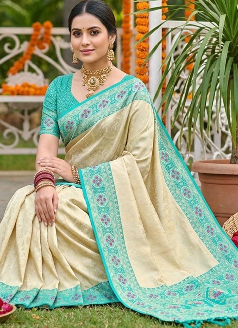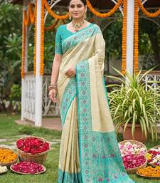 Sutriti elegant cream & turquoise art silk kanjivaram style saree with rich zari border & paisley pallu