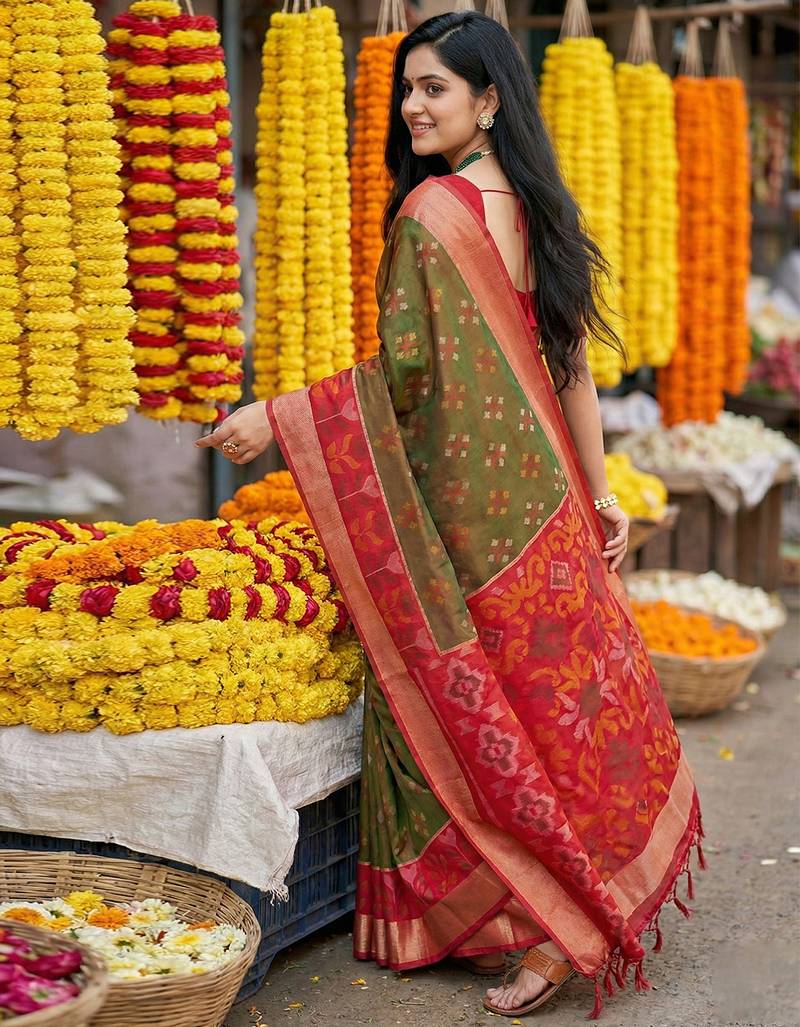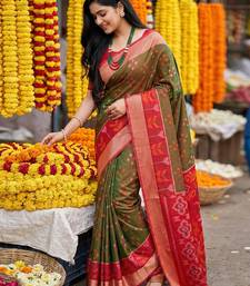Sutriti exquisite brown & red pochampalli soft silk saree with grand ikat woven pallu