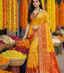Sutriti exquisite yellow & red pochampalli soft silk saree with grand ikat woven pallu