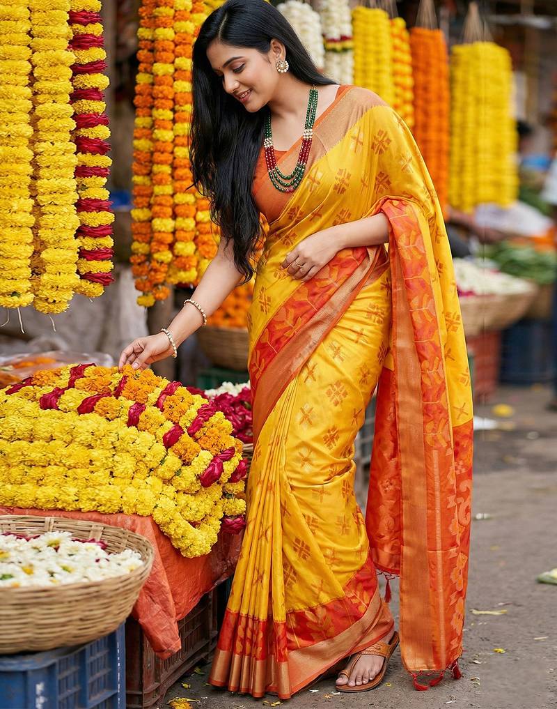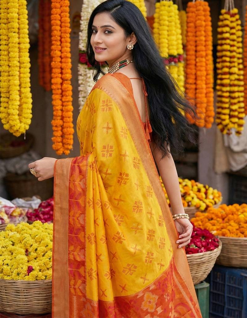 Product Name Sutriti Exquisite Yellow & Red Pochampalli Soft Silk Saree With Grand Ikat Woven Pallu