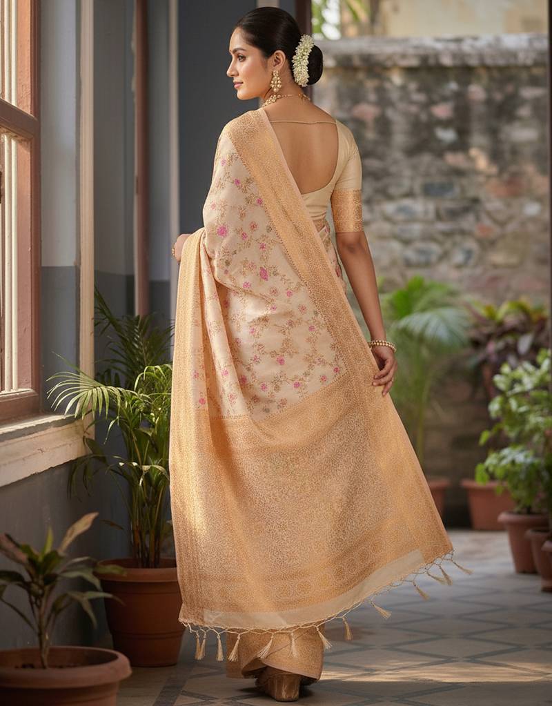 Sutriti graceful white banarasi silk saree with golden zari woven border & floral jaal – wedding & festive wear
