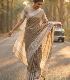 Sutriti women beige & silver-toned woven design linen blend saree