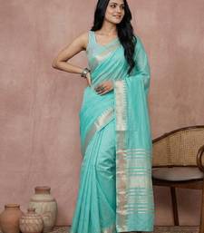Sutriti women's turquoise blue pure linen saree with zari border & blouse piece
