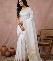 Sutriti women's white pure linen saree with gold zari border & blouse piece