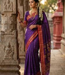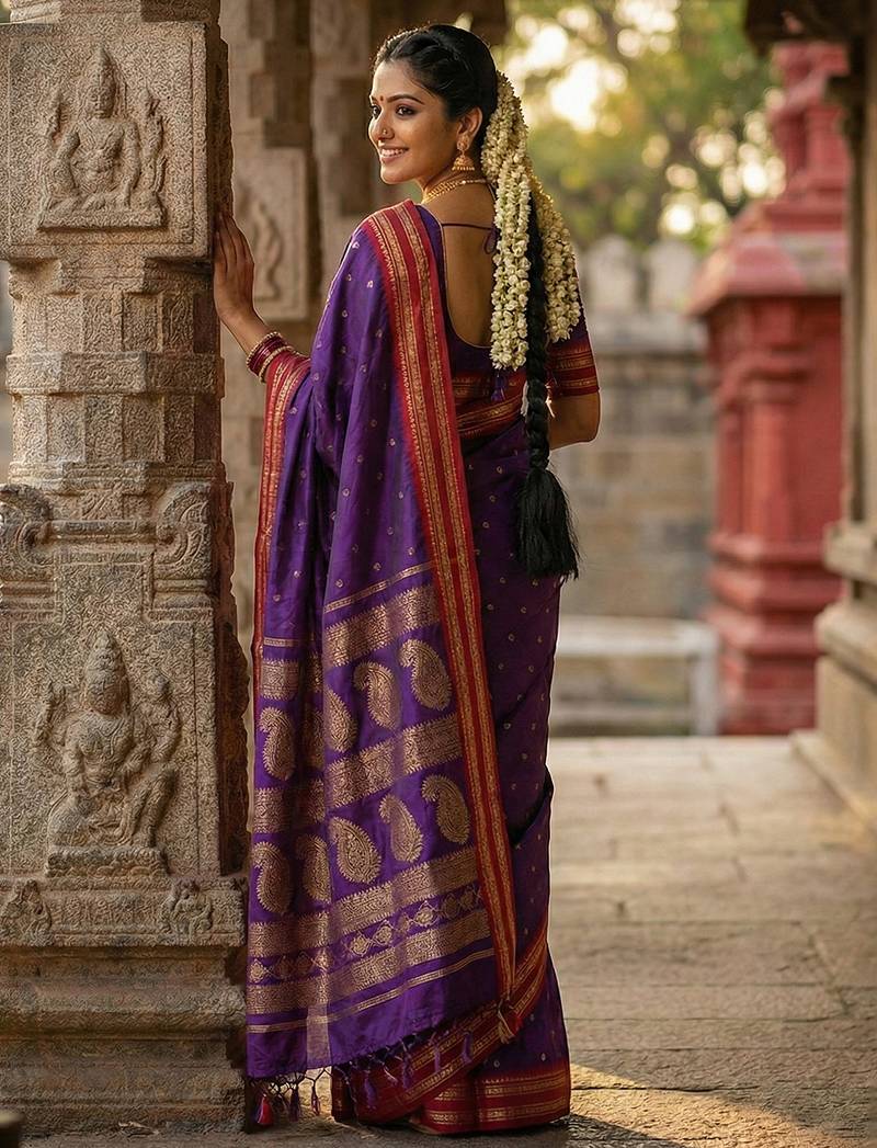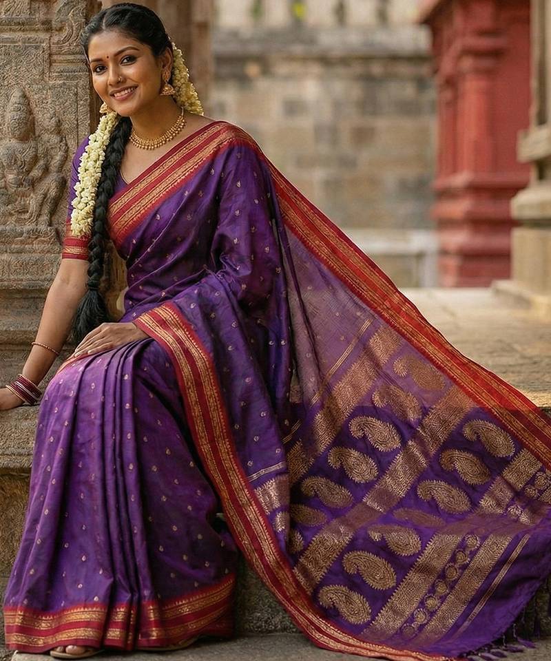 | Product Description | Channel Your Inner Queen With This Majestic Amethyst Soft Silk Saree, A Color Historically Associated With Royalty And Luxury. The Vibrant Purple Body Is A Vision Of Opulence, Dotted With Shimmering Gold Zari Motifs. It Is Striking Against The Contrasting Bright Red Border, Which Is Richly Woven With Heavy Gold Zari In Traditional Patterns. The Pallu Is A Grand Affair, Featuring Large, Intricate Paisley Designs That Add To Its Regal Appeal. |
