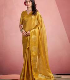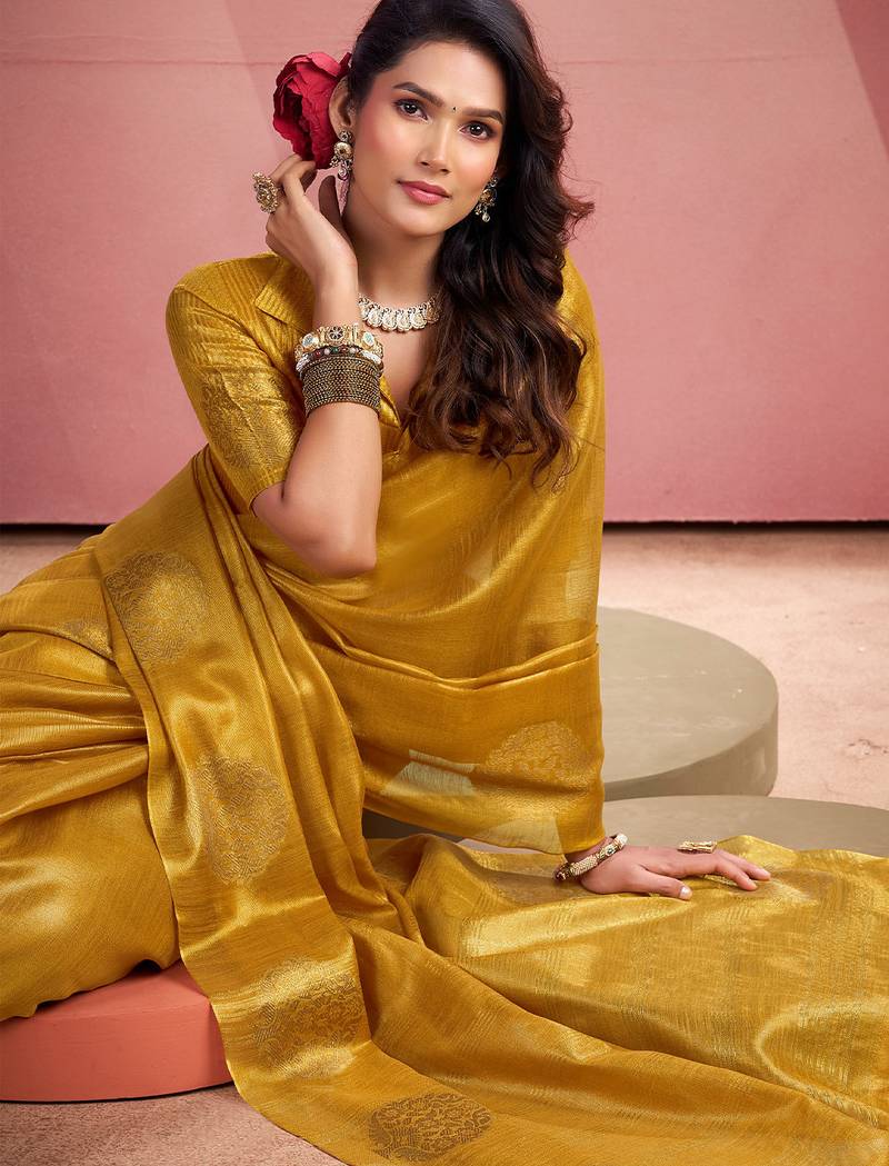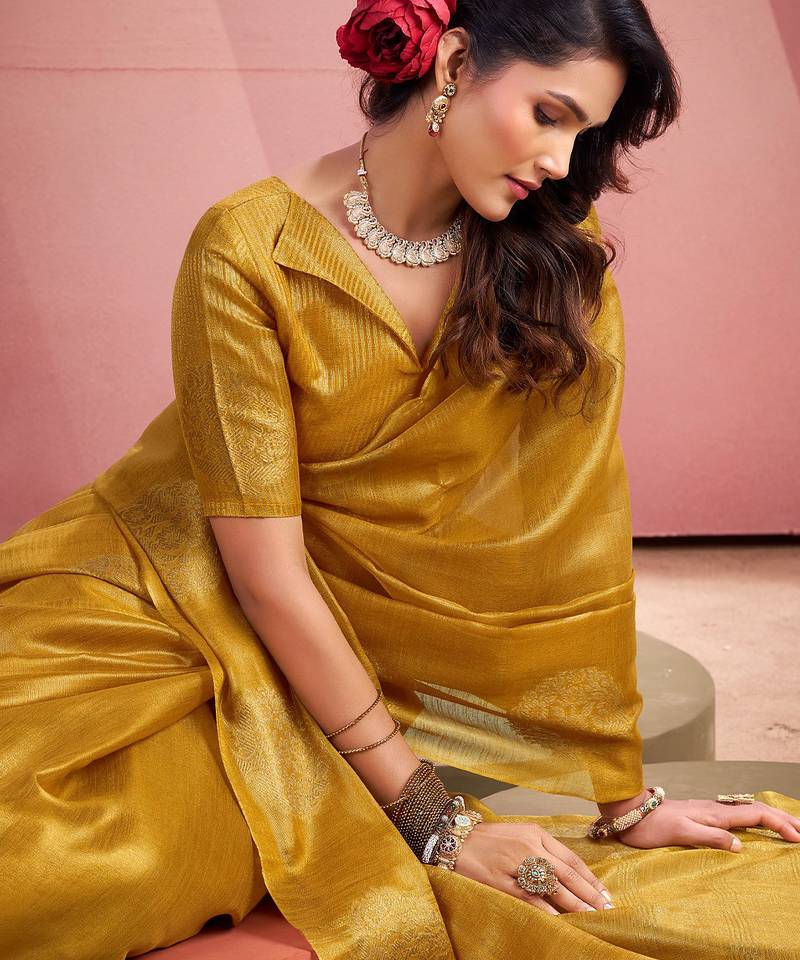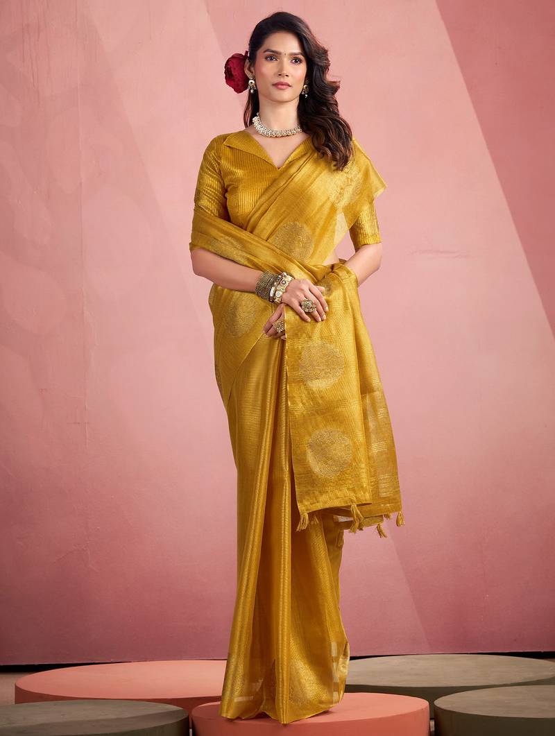Mustard yellow woven tissue silk blend saree with mandala motifs