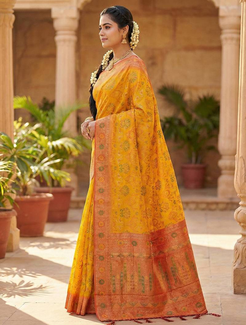 Woven banarasi , kanjivaram silk blend saree mustard & orange - vibrant ethnic wear