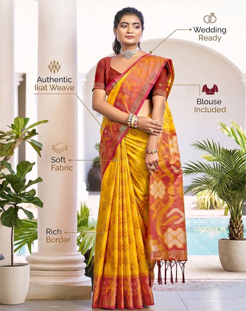 | Product Name | Yellow & Orange Pochampalli Soft Silk Blend Saree With Traditional Ikat Pallu Sari | |
