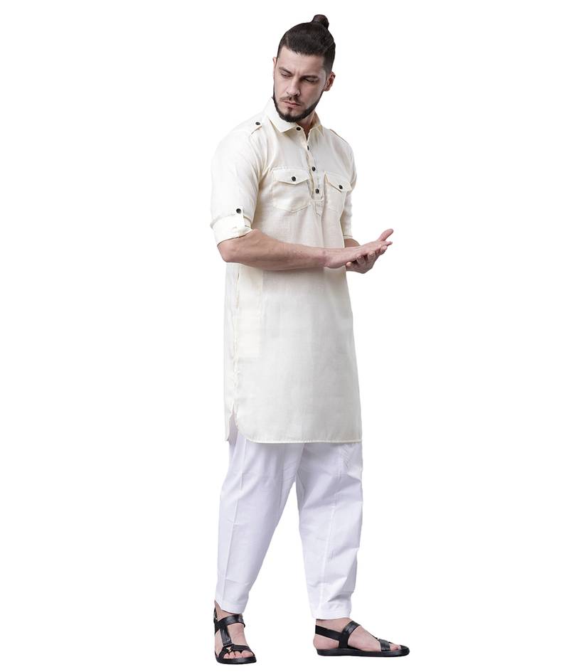 | Product Description | Svanik Cream Blended Solid Men's Fashion Pathani Kurta Is A Trendy Kurta With Pathani Styling. This Kurta Has A Classic Double Pocket Double Flap Detailing, Shirt Collar, Full Sleeves That Can Be Rolled Up, A Curved Hemline And Side Slits. Pair This Stylish Kurta For Men With Pathani Salwar Or Jeans To Get The Full Men's Ethnic Style. |