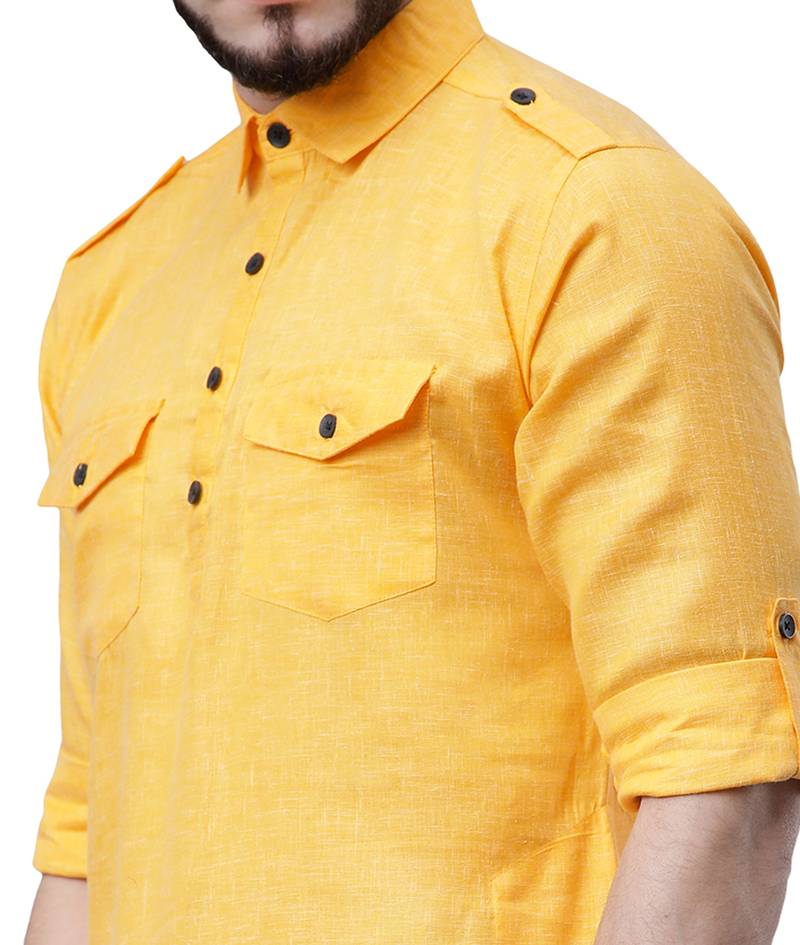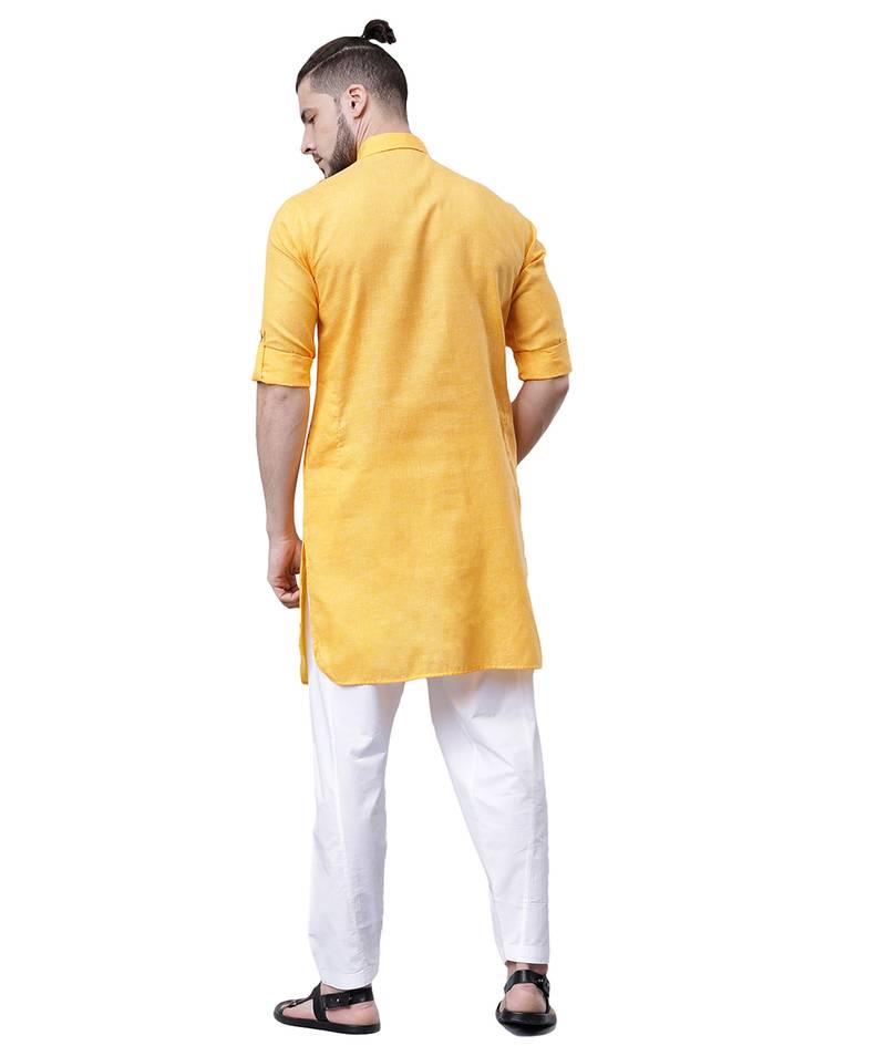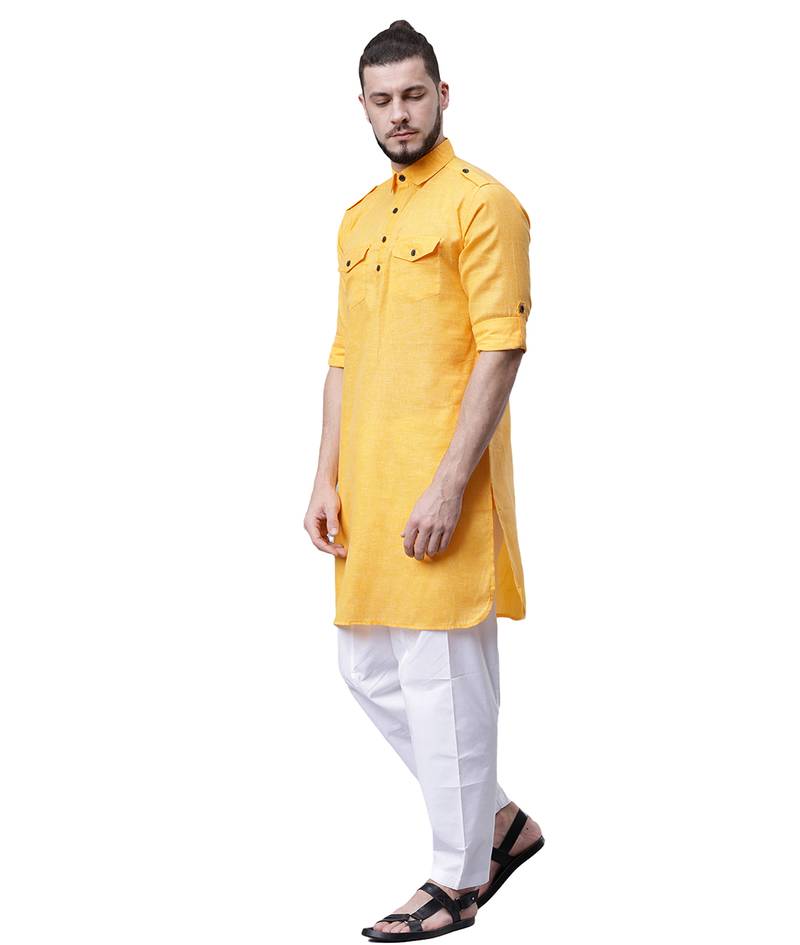 | Product Description | Svanik Yellow Blended Solid Men's Fashion Pathani Kurta Is A Trendy Kurta With Pathani Styling. This Kurta Has A Classic Double Pocket Double Flap Detailing, Shirt Collar, Full Sleeves That Can Be Rolled Up, A Curved Hemline And Side Slits. Pair This Stylish Kurta For Men With Pathani Salwar Or Jeans To Get The Full Men's Ethnic Style. |
