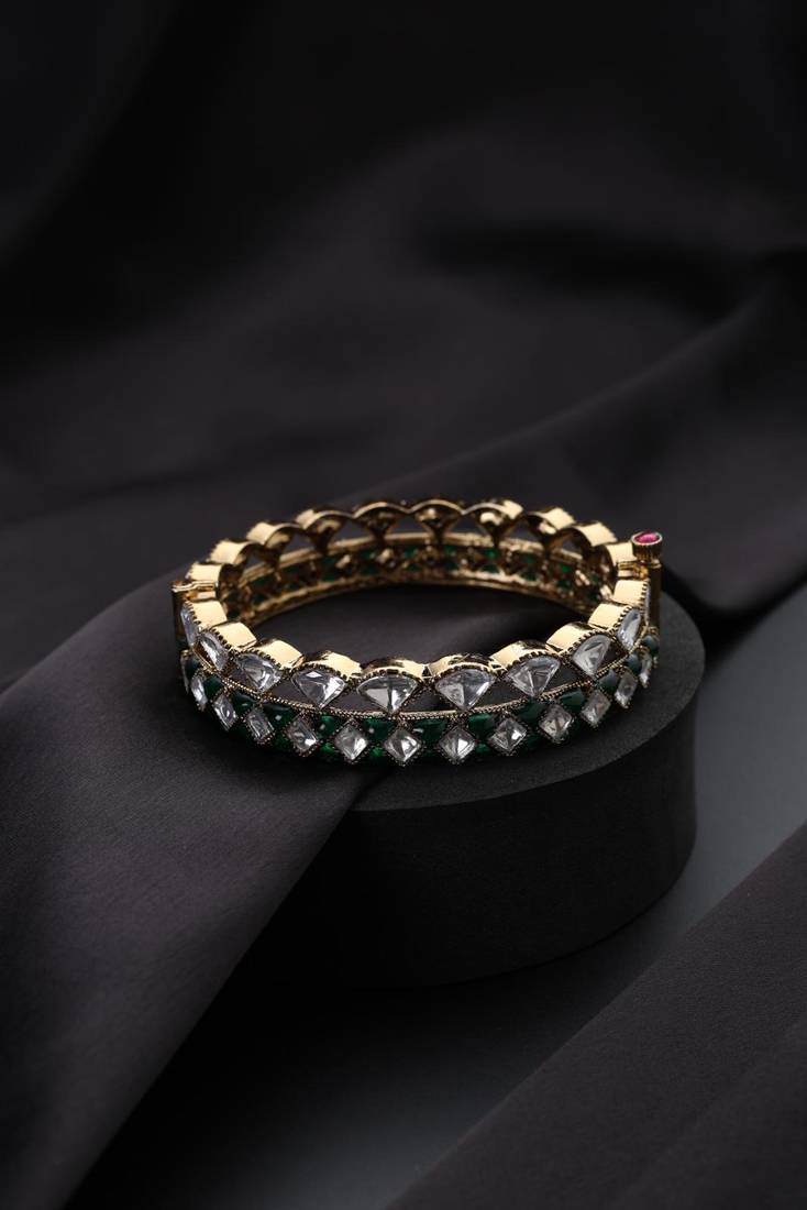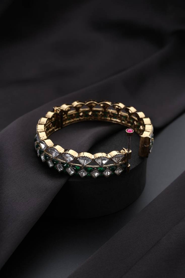 | Product Description | These Gold Plated Green Stone Polki Bracelets Are A Perfect Blend Of Elegance And Tradition. Adorned With Intricate Polki Work And Striking Green Stones, They Exude A Regal Charm. The Rich Gold Plating Adds A Luxurious Finish, Making Them Ideal For Weddings, Festive Occasions, And Special Celebrations, Complementing Both Ethnic And Contemporary Outfits.