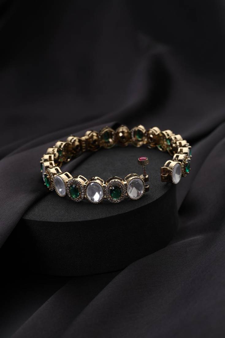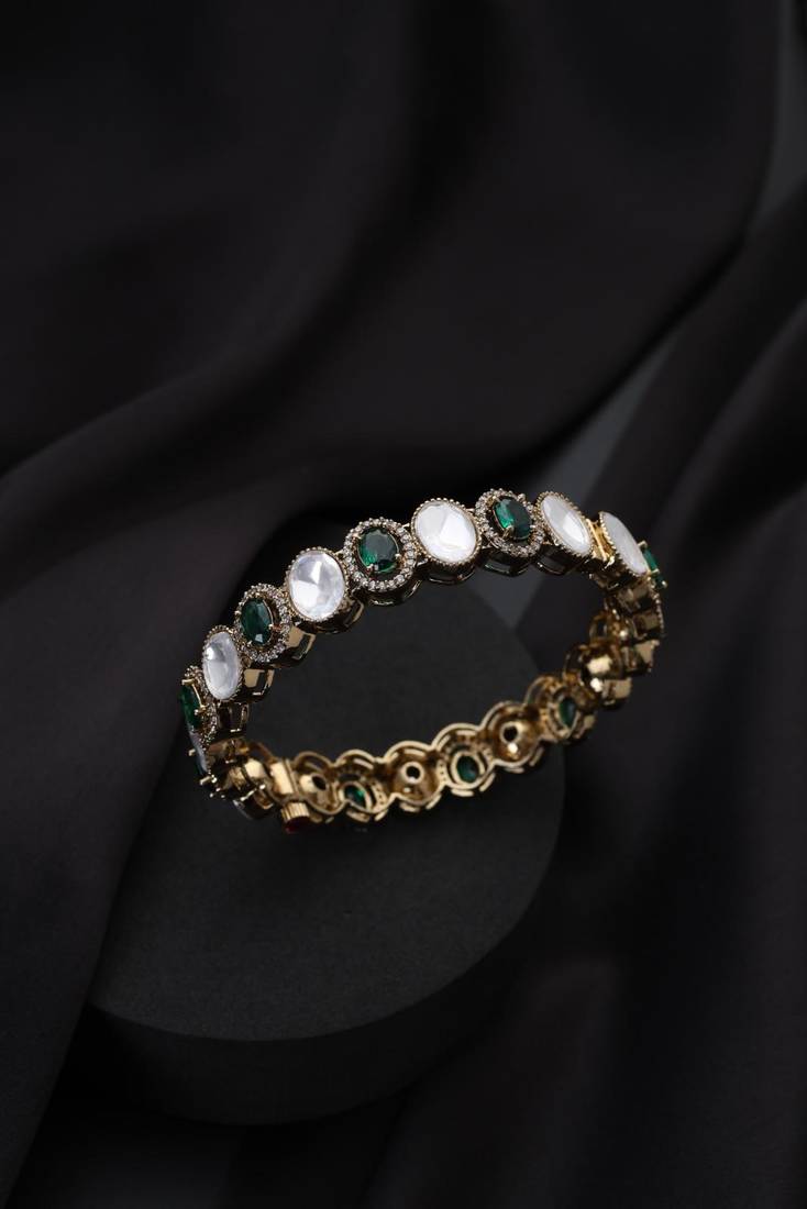 | Product Description | These Gold Plated Green Stone Polki Bracelets Are A Perfect Blend Of Elegance And Tradition. Adorned With Intricate Polki Work And Striking Green Stones, They Exude A Regal Charm. The Rich Gold Plating Adds A Luxurious Finish, Making Them Ideal For Weddings, Festive Occasions, And Special Celebrations, Complementing Both Ethnic And Contemporary Outfits.