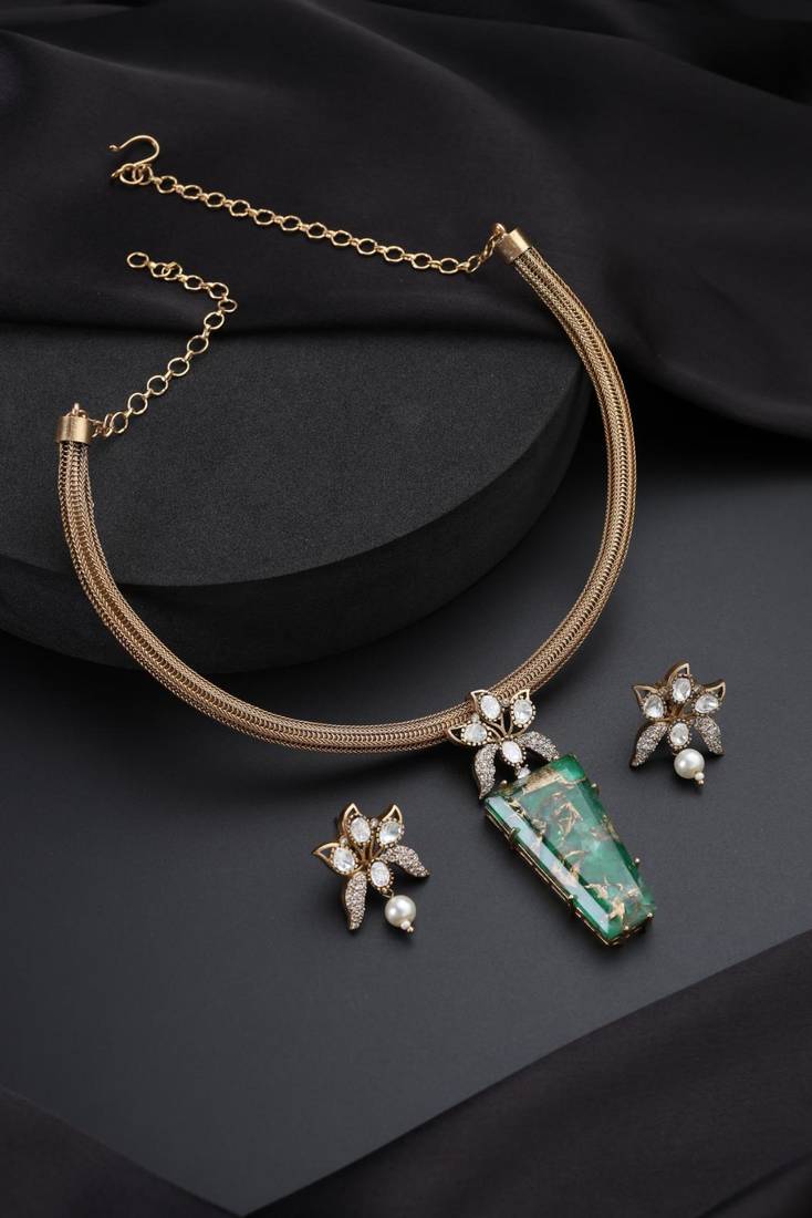 | Product Description | This Gold Plated Green Stone Polki Necklace Exudes Regal Elegance And Timeless Beauty. Featuring Intricate Polki Work Highlighted With Striking Green Stones, It Is Finished With Luxurious Gold Plating For A Rich Appeal. Perfect For Weddings, Festive Occasions, And Special Celebrations, It Pairs Beautifully With Both Traditional And Fusion Outfits.