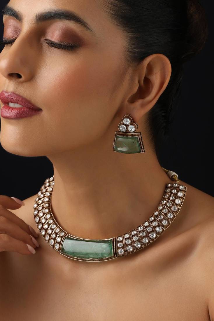 | Product Description | This Gold Plated Green Stone Polki Necklace Exudes Regal Elegance And Timeless Beauty. Featuring Intricate Polki Work Highlighted With Striking Green Stones, It Is Finished With Luxurious Gold Plating For A Rich Appeal. Perfect For Weddings, Festive Occasions, And Special Celebrations, It Pairs Beautifully With Both Traditional And Fusion Outfits.