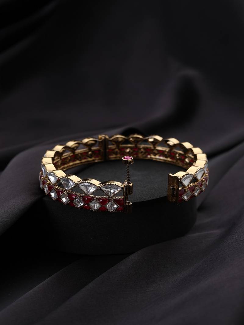 | Product Description | Add A Touch Of Vibrant Elegance To Your Wrist With This Gold Plated Polki Bangle. It Features A Striking Red Polki Stone At Its Center, Surrounded By Intricate Gold Work. The Traditional Design And Rich Color Make It A Magnificent Accessory, Perfect For Adding A Dash Of Drama And Classic Luxury To Your Festive Attire Or Special Occasions