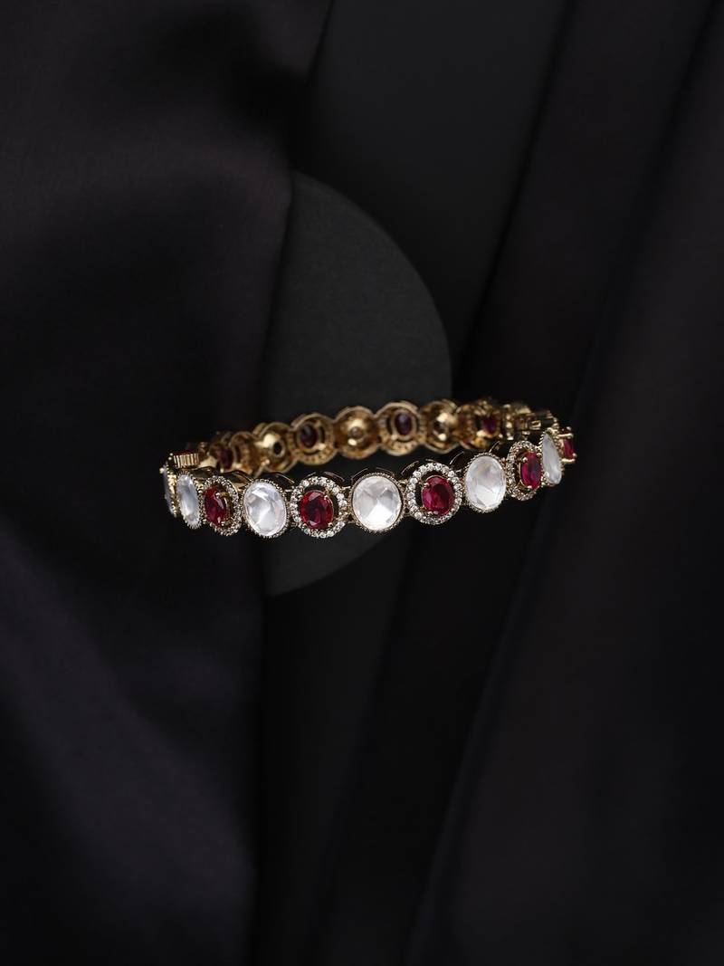 | Product Description | A Striking Blend Of Tradition And Vibrancy, This Gold Plated Polki Bangle Features A Captivating Red Stone At Its Center. The Intricate Polki Work And Antique Gold Finish Create A Luxurious Setting For The Bold, Ruby Like Hue. This Magnificent Piece Is A True Statement Accessory, Perfect For Adding A Touch Of Drama And Elegance To Your Festive Attire