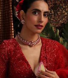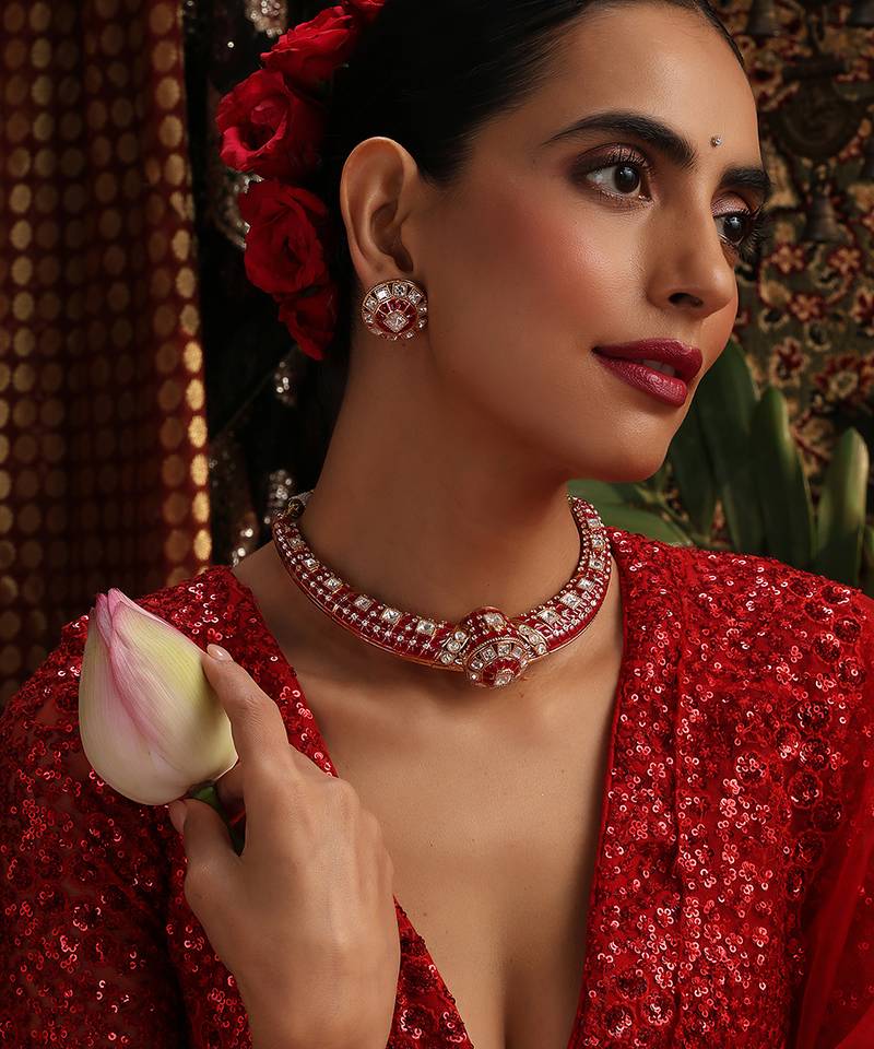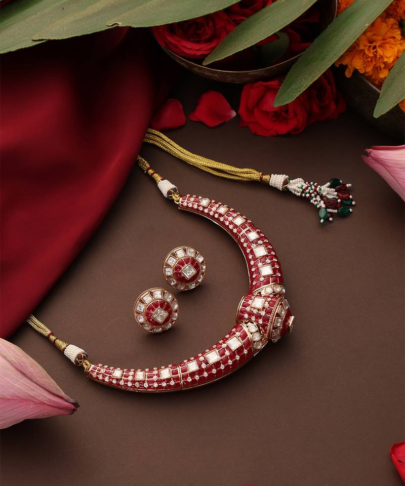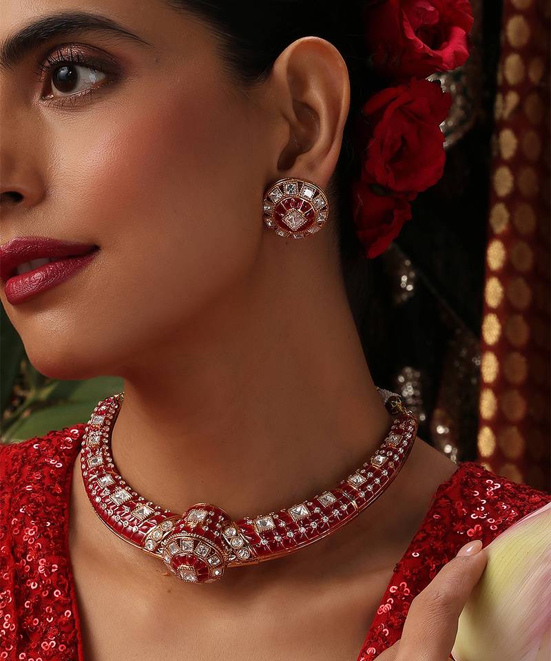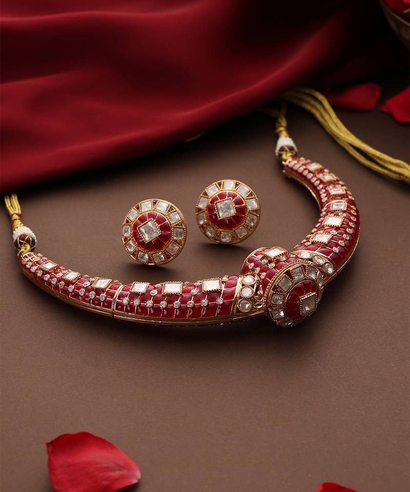 This Rose Gold Plated Necklace Set Is Adorned With Striking Red Stones, Exuding Timeless Elegance And Festive Charm. Crafted With Intricate Detailing, It Beautifully Enhances Traditional And Bridal Attire. Perfect For Weddings And Special Occasions, It Adds A Graceful, Statement Touch To Ethnic Ensembles.