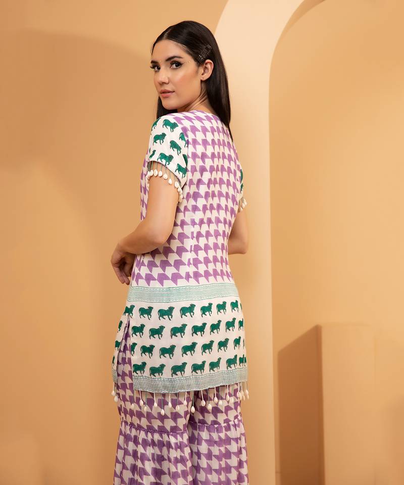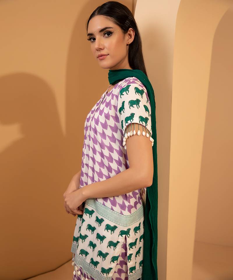 | Product Description | The Sharara Set In Our Handblock Cow Print Is Effortlessly Stylish, Paired With A Crushed Mul Dupatta. Ps Don't Miss Those Adorable Shells. |