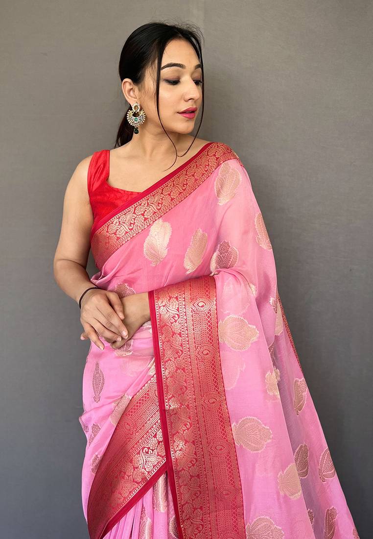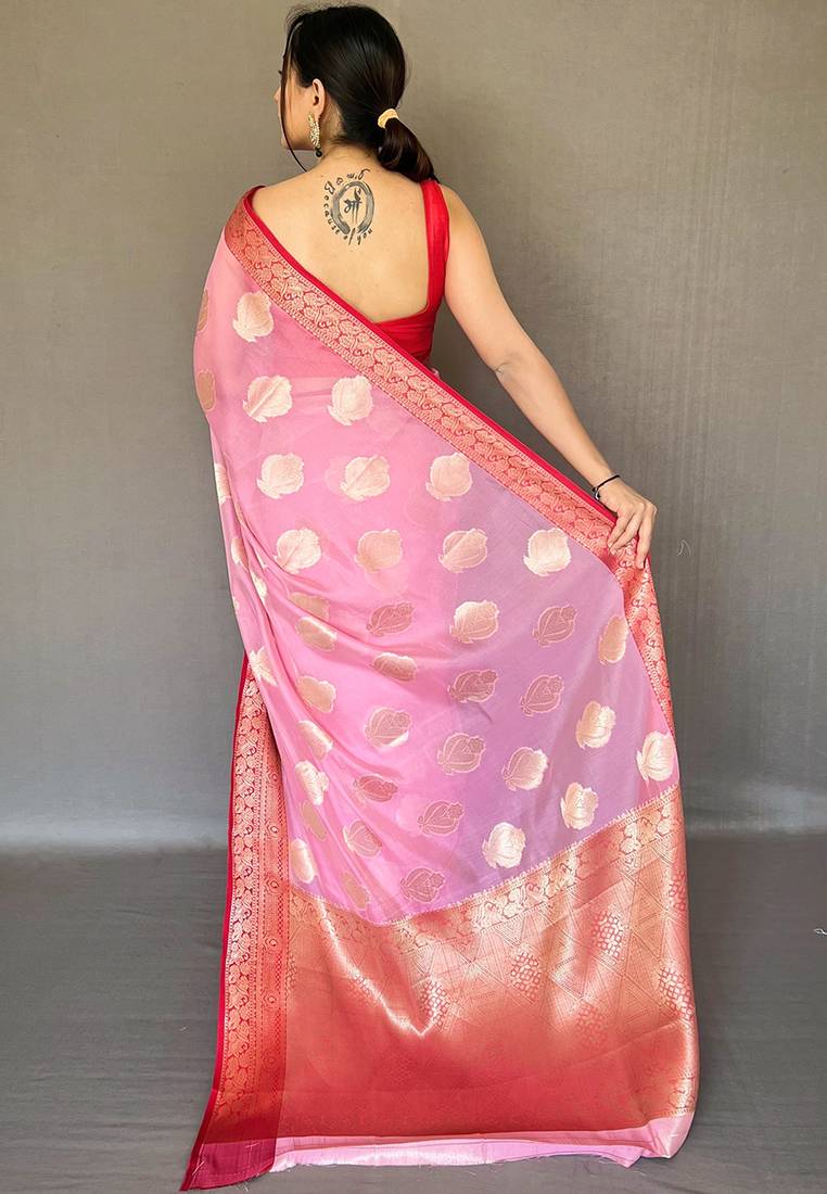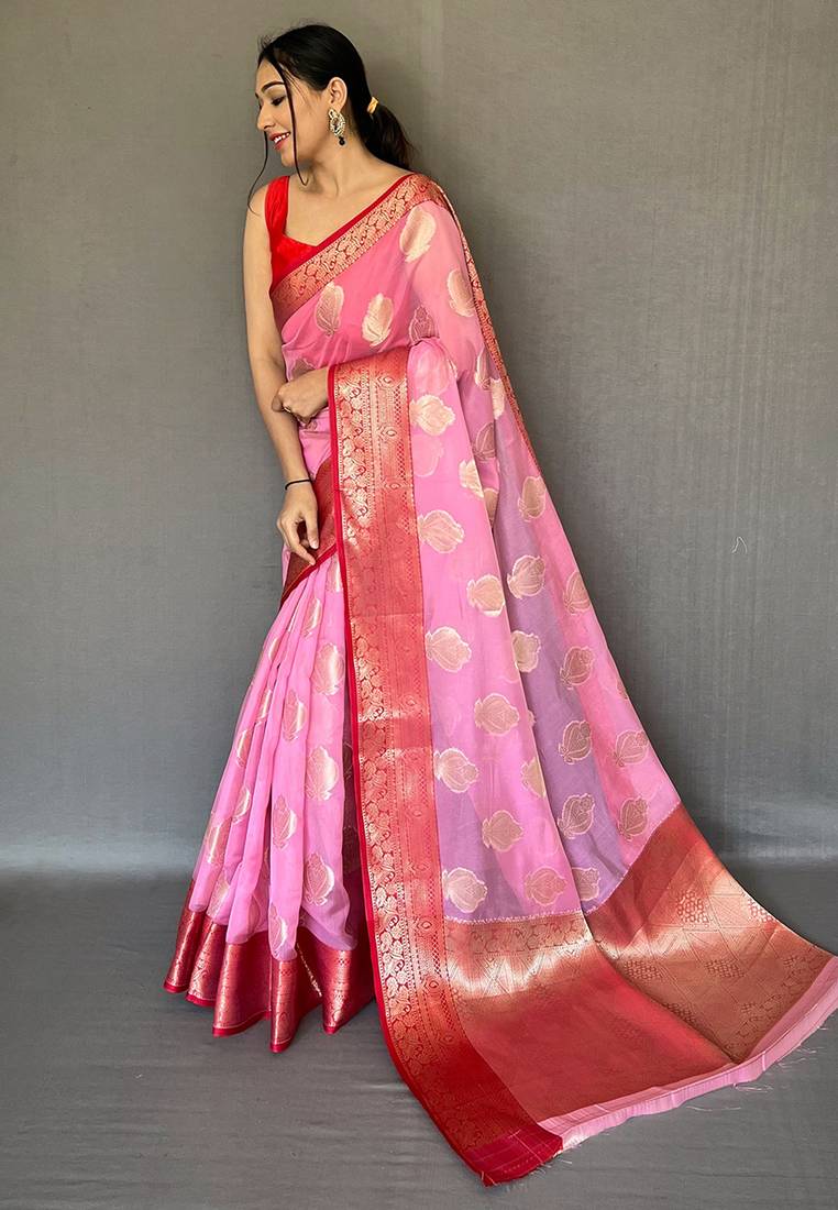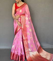 Pink woven organza saree with blouse