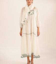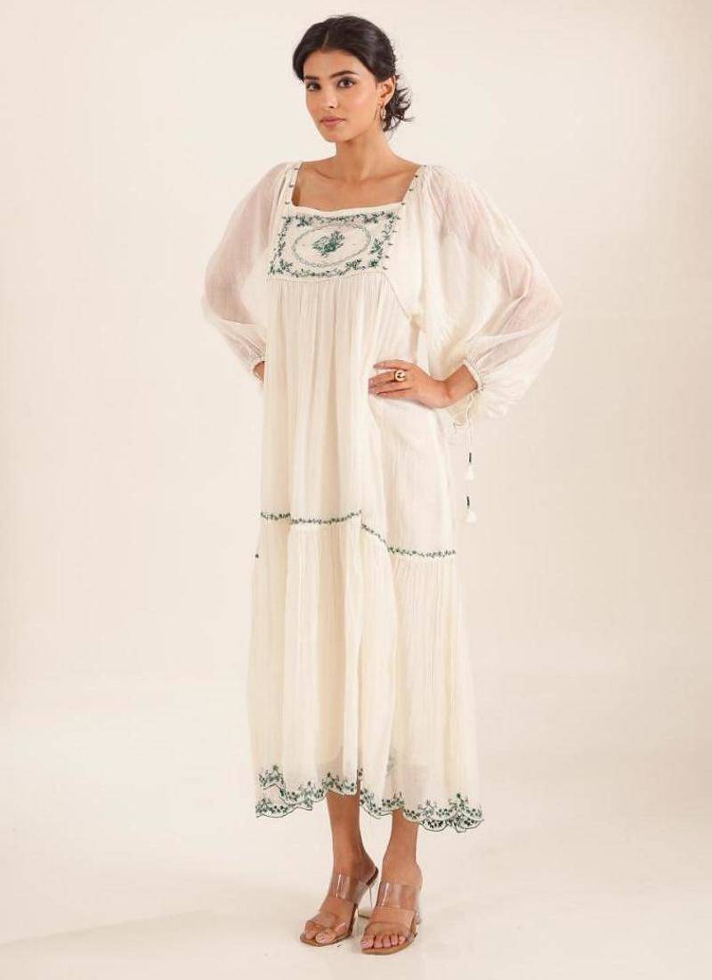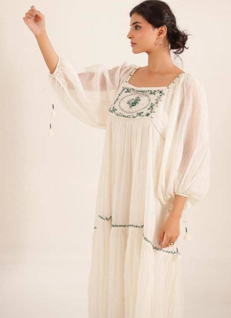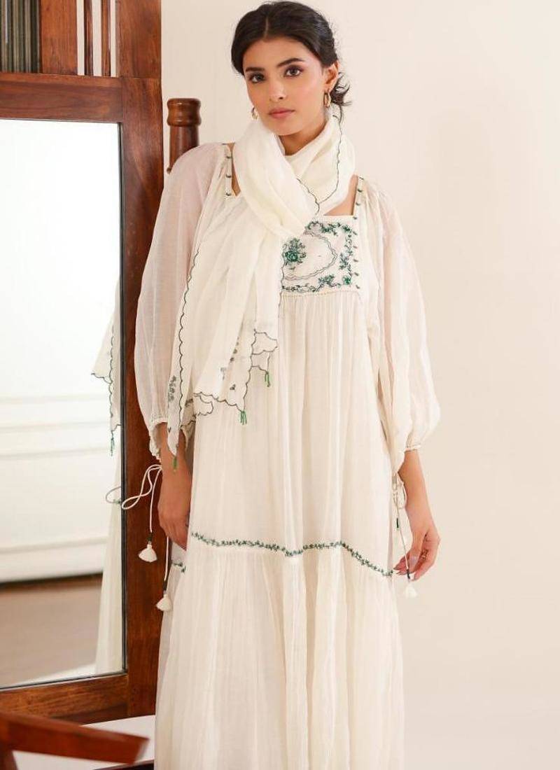 A Soft, Flowy White Victorian Dress That Feels Light .It Has A Loose, Comfortable Fit With Full Length, Balloon Style Sleeves And A Beautiful Bow Like Tie Up Back.The Neckline And Hem Have Delicate Green Resham Embroidery, Adding A Pretty, Handmade Touch.Made With Pure Mal Chanderi Fabric, And Soft Inside Slip.It Comes With A Matching Dupatta That Has Light Green Threadwork To Complete The Look.