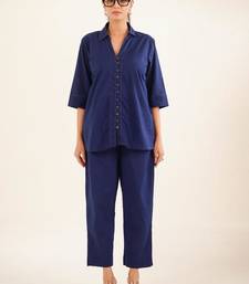 | Product Description | This Navy Blue Co Ord Set Is Made From Soft And Breathable Cambric Fabric, Making It For All Day Comfort.The Shirt Style Top Features A Collar, A V Neckline, And A Full Button Down Front With Contrast Stitching That Adds A Smart Touch.It Has Three Quarter Sleeves And A Relaxed Fit For Easy Movement.Paired With Straight Fit Pants, This Set Offers A Polished Yet Laid Back Look That's Perfect For Office Wear, Casual Outings . |